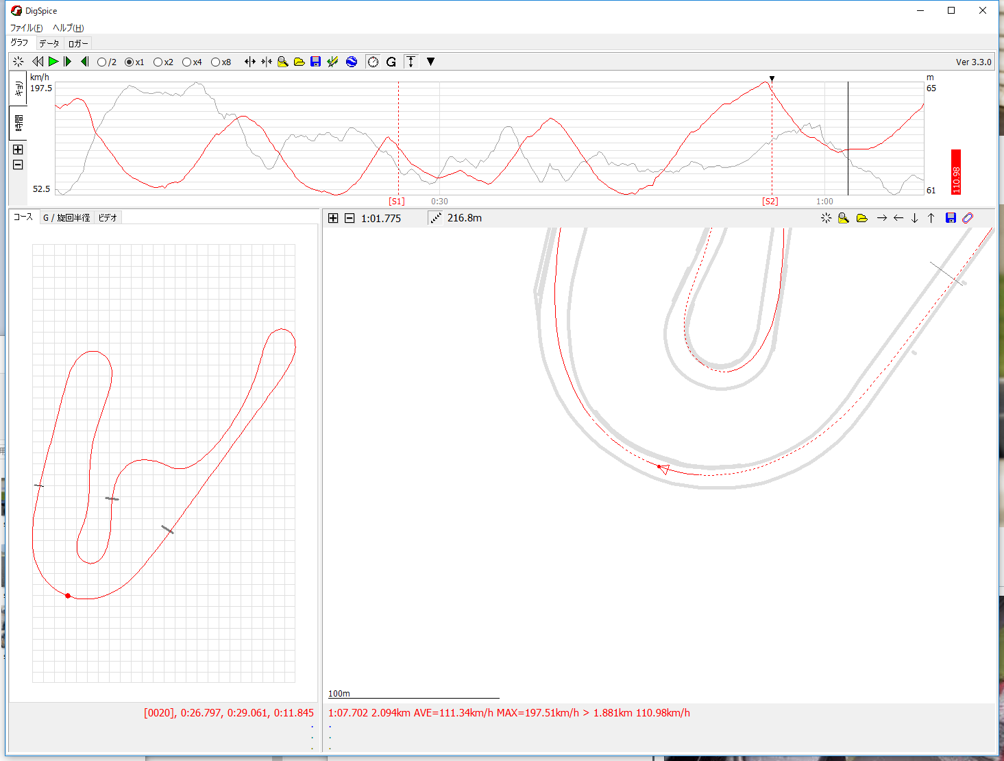 高温でパワーダウンが大きいようなので、タイムは今までとほぼ同じくらいでした。最終コーナーの最低速度は約110km/hです。
