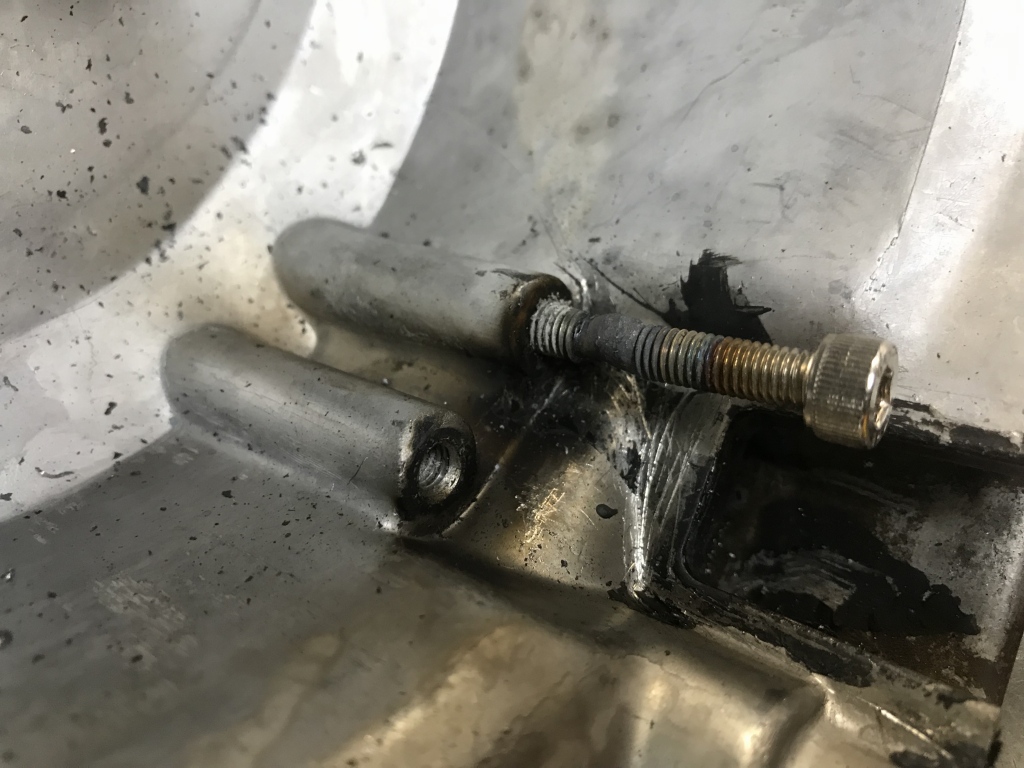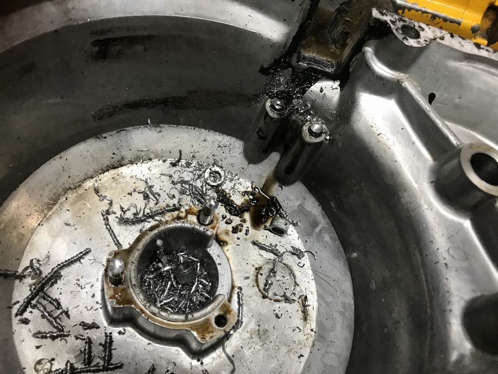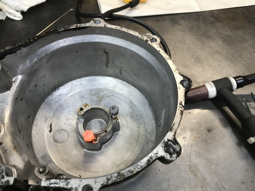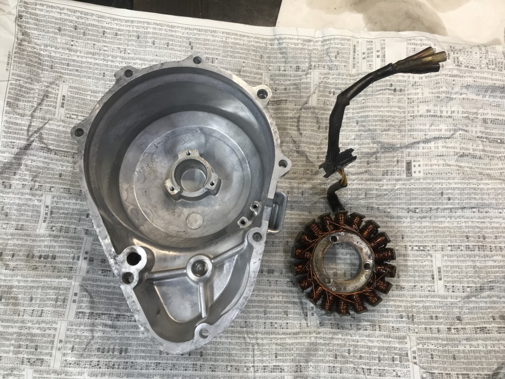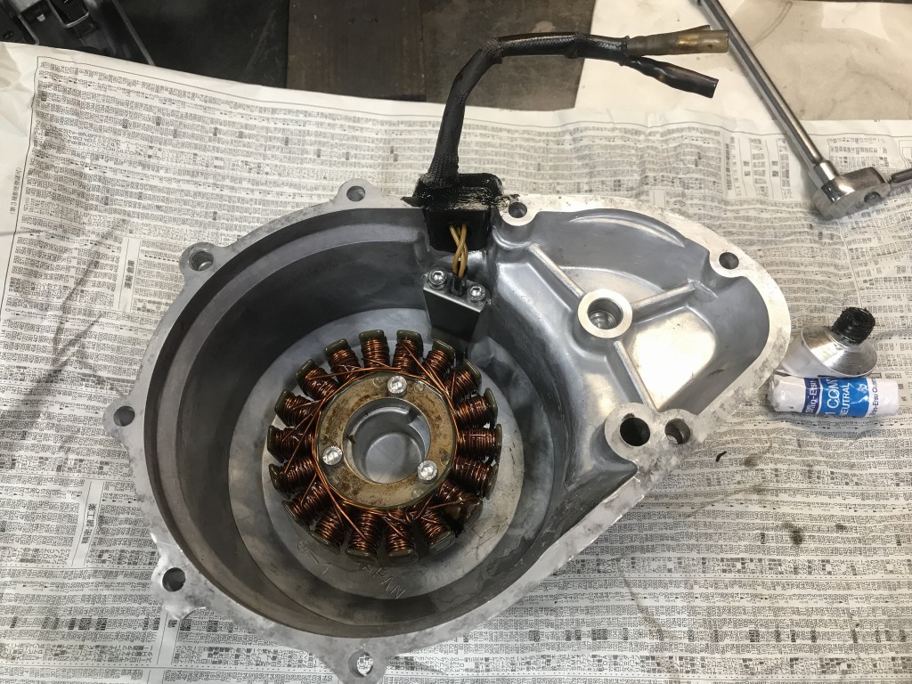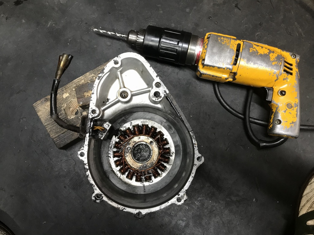 ジェネレーターカバーは、グロメットのシールをやり直すのでコイルを外そうとしましたが、ネジロックが塗られたネジは緩まないで頭をなめたのでドリルで揉んで外します。