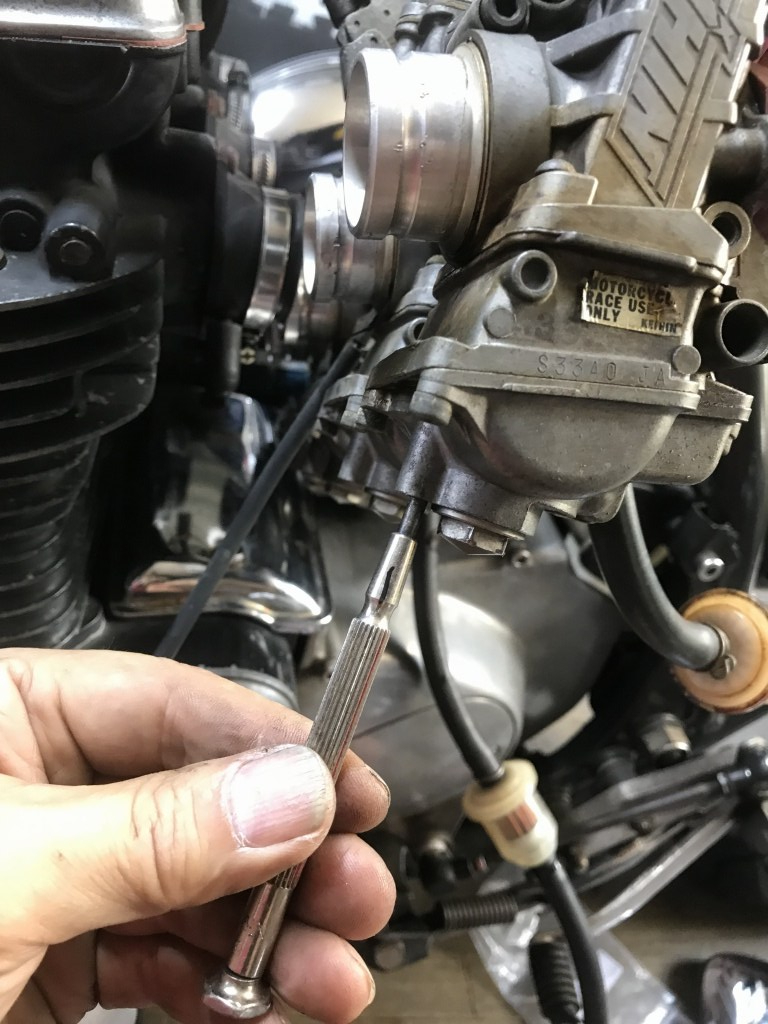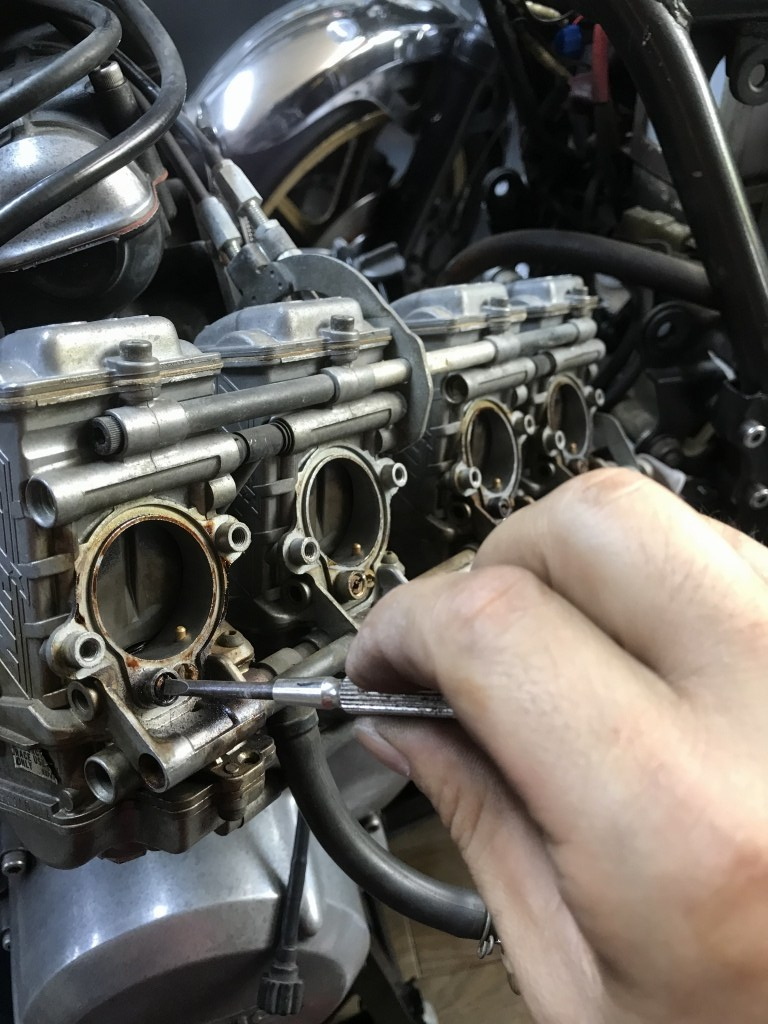初めにパイロットスクリューを4気筒ともイニシャル状態にセットします。スロー調整はエアスクリューで行います。
