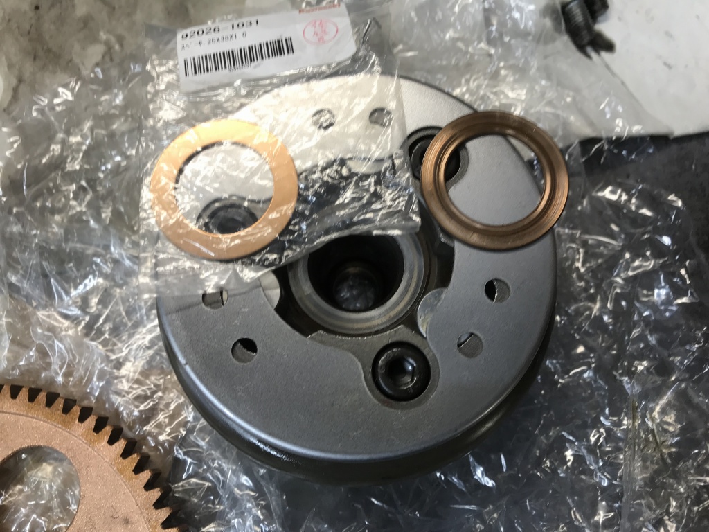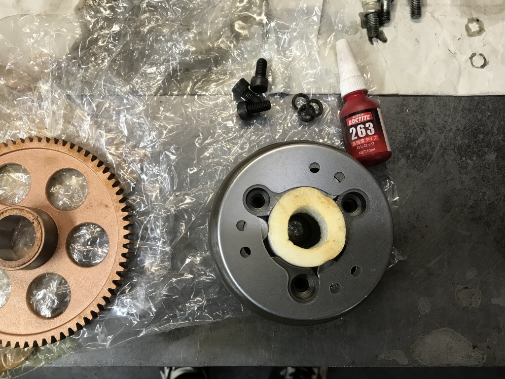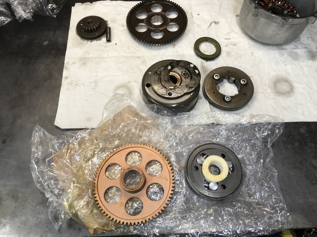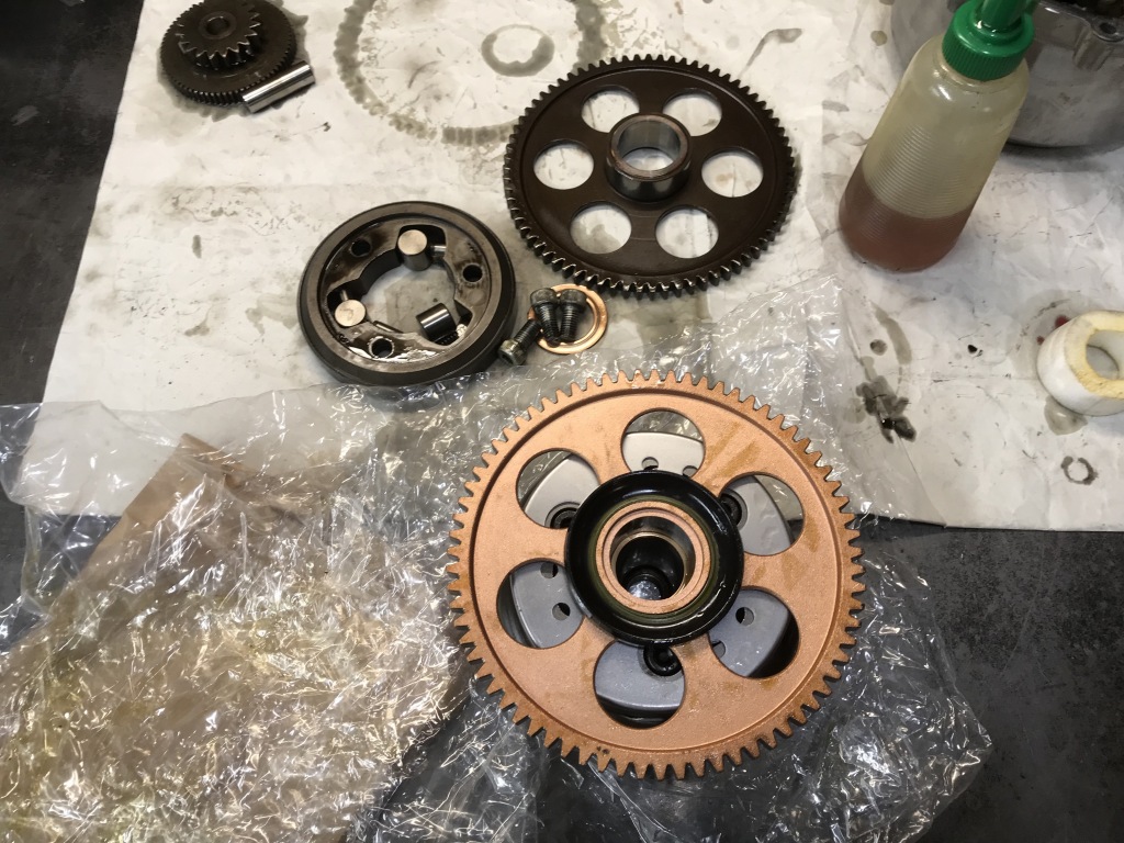 スタータークラッチを分解し、クラッチとギヤを新品交換します。