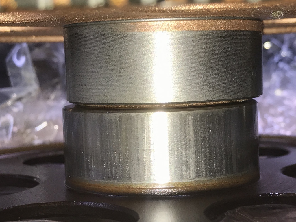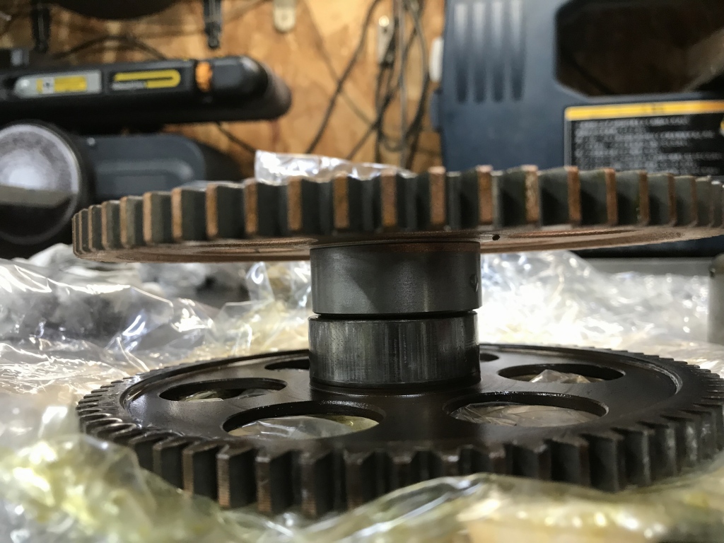 新旧のギヤを比べるとこんな感じです。下の古い方にはクラッチローラーの圧痕がだいぶ付いているのが解ります。