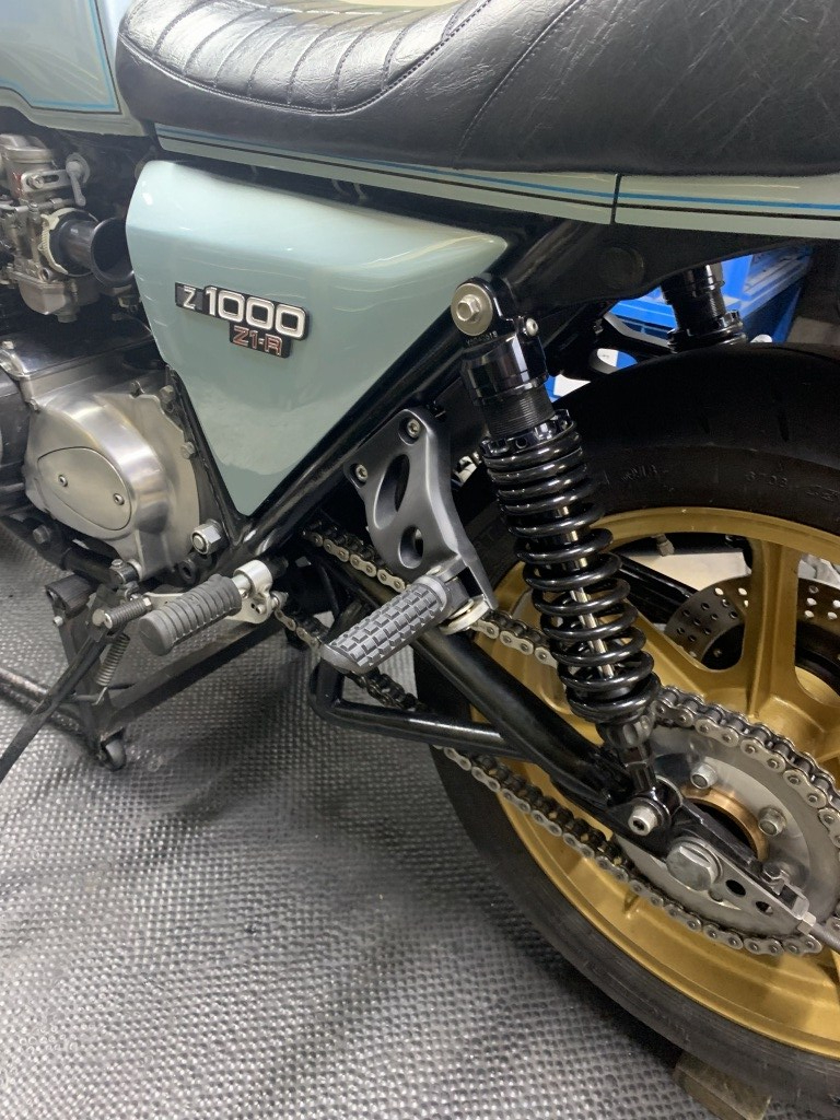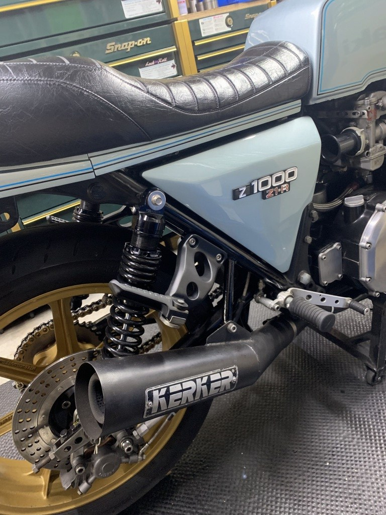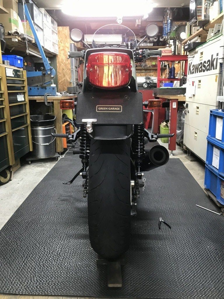 後ろから見るとこんな感じ。ZRX1100用は同じリヤ2本サス使用なので張り出しも大きく都合がいいです。純正なのでパッセンジャーの乗り心地も比較的良く実用性も十分あります。