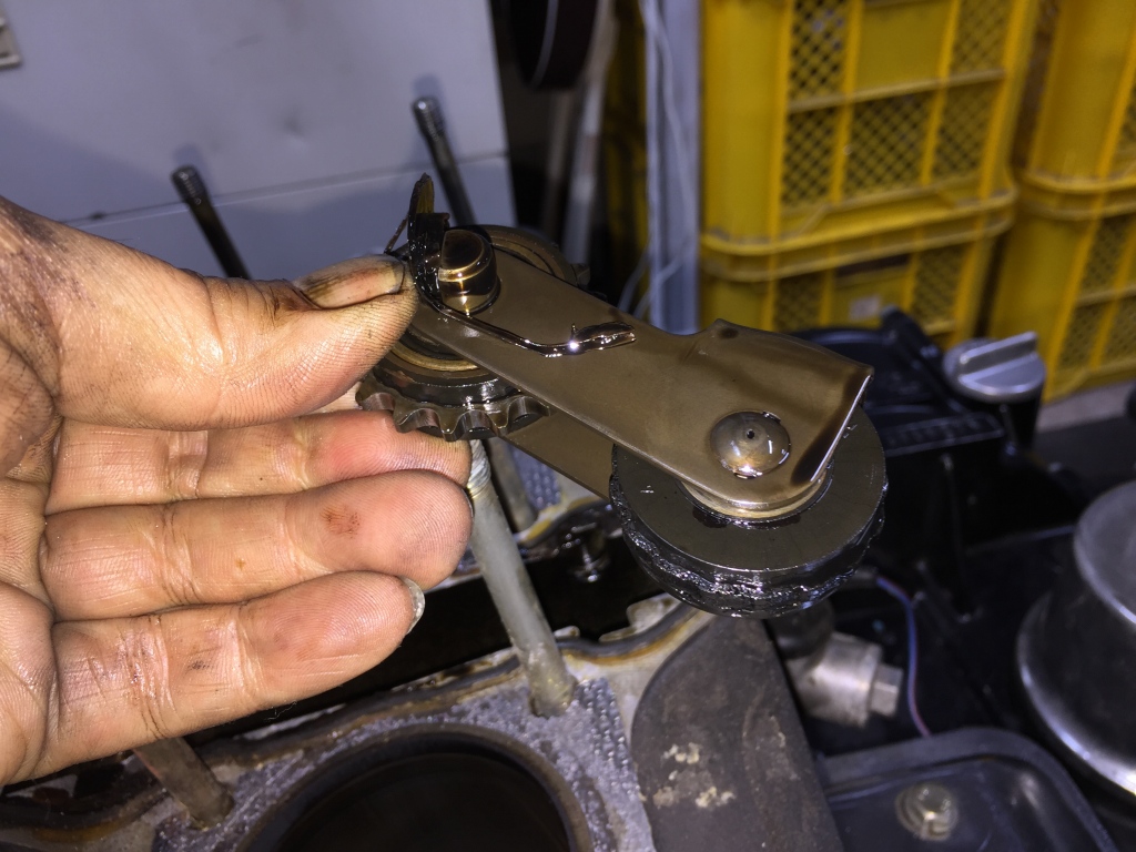 カムチェーンテンショナーのローラーは凸凹に摩耗しています。