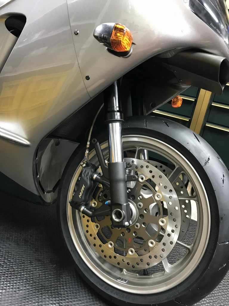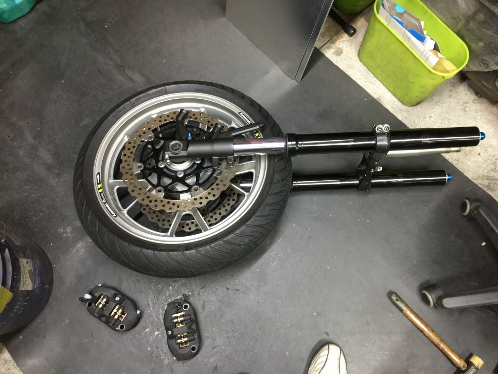 14Rのフォークを仮組して確認します。ホイールやキャリパーもまるごと14R純正を流用します。