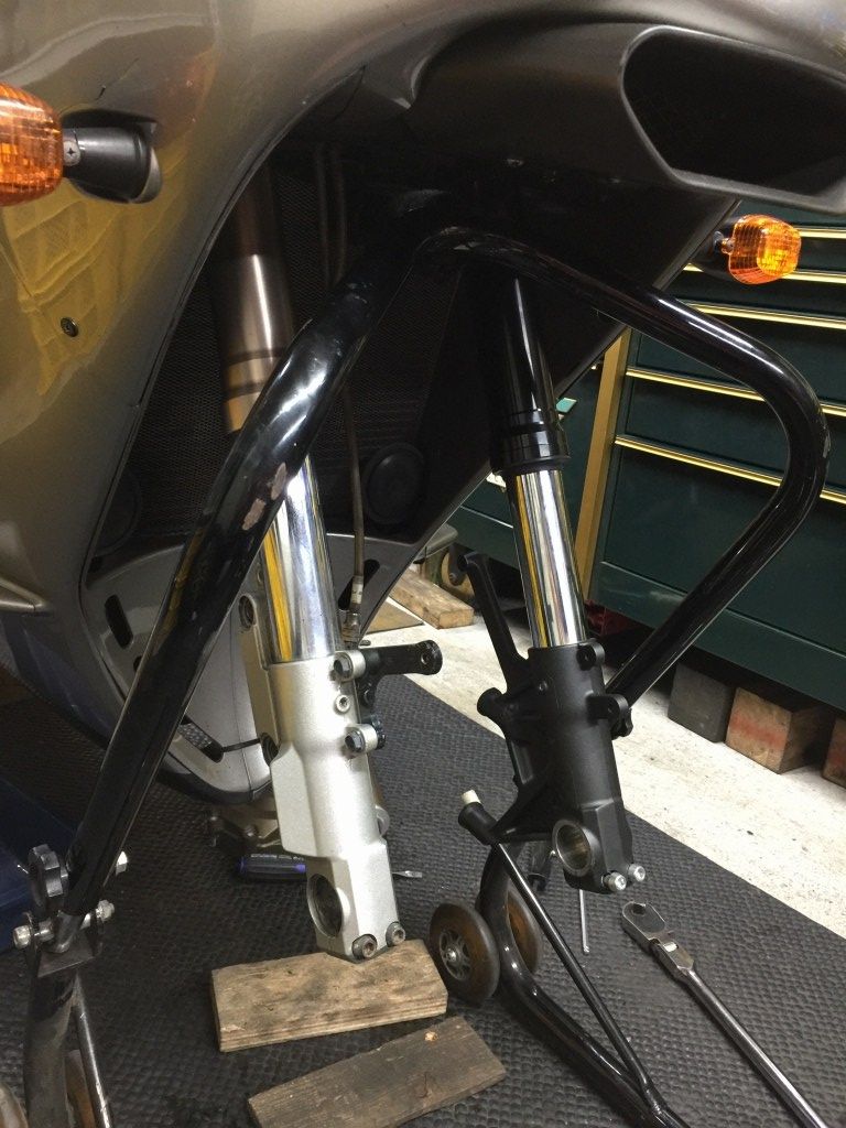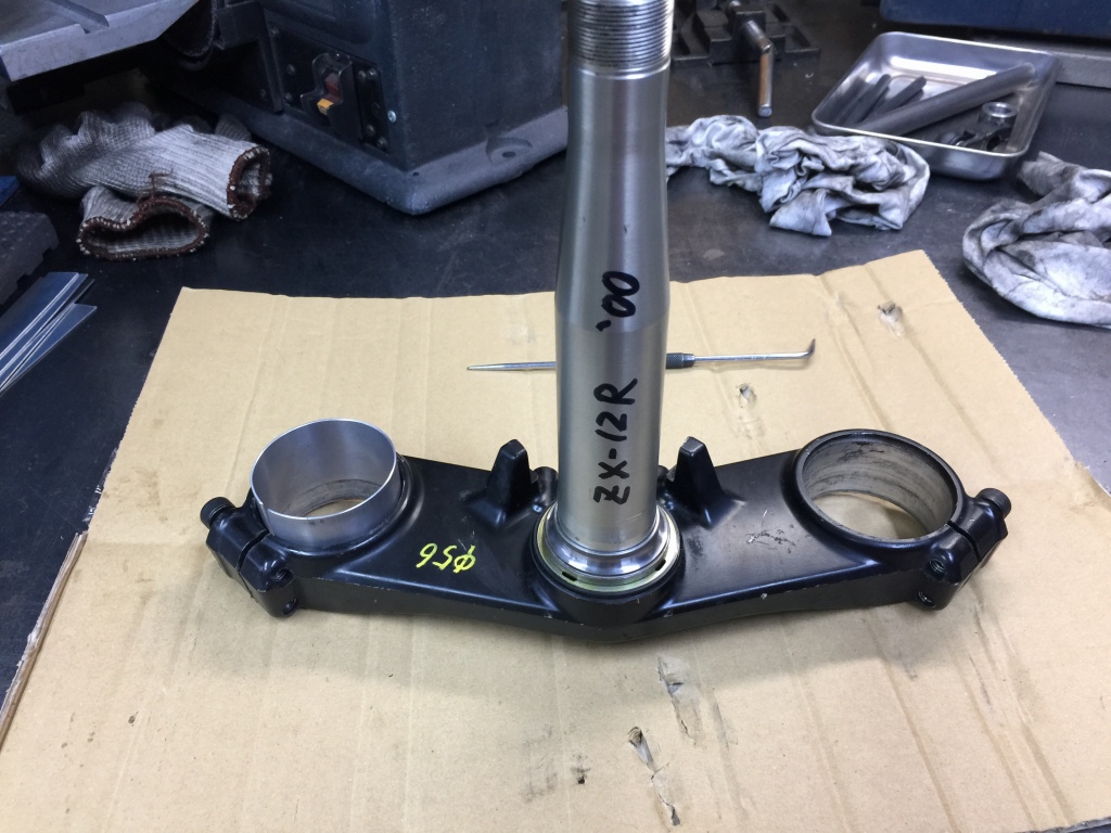 上下ステムは12Rのままで、先ほど製作したスペーサーをセットして14Rの純正フォークを組みます。