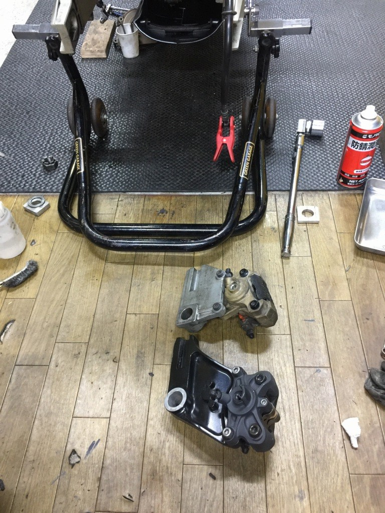 唯一違うのは、ローターとキャリパーのセンターが合わないことで、スペーサーを作ってローターを外側にオフセットさせて対応します。
