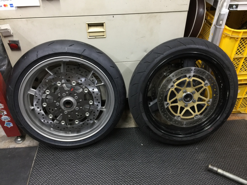 フロントホイールは、ローターの取り付けが大きく異なります。左の14R用には、サンスターのプレミアムディスクを組み合わせました。ローター径は14Rがφ310ミリですが、12Rと同じφ320ミリのオーバーサイズ仕様としました。