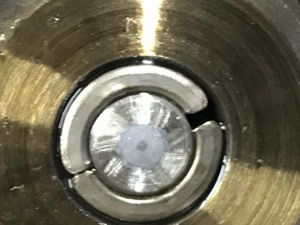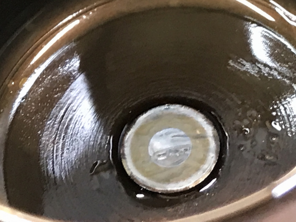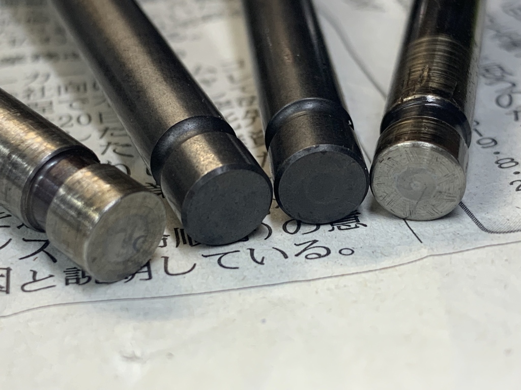ステムエンドが限界まで研磨されており、コッターとほぼ面一です。エンドの研磨は平面ではなく中凸なので、リフター側も中心が摩耗しています。インテーク側4ヶ所ともこれと同じです。