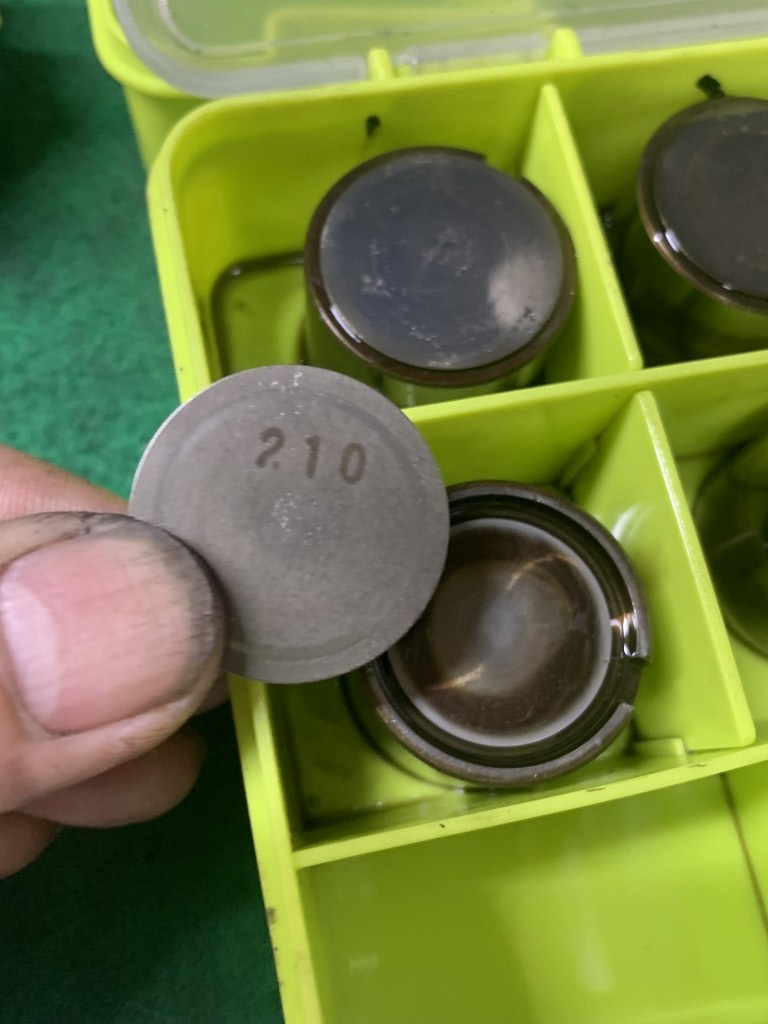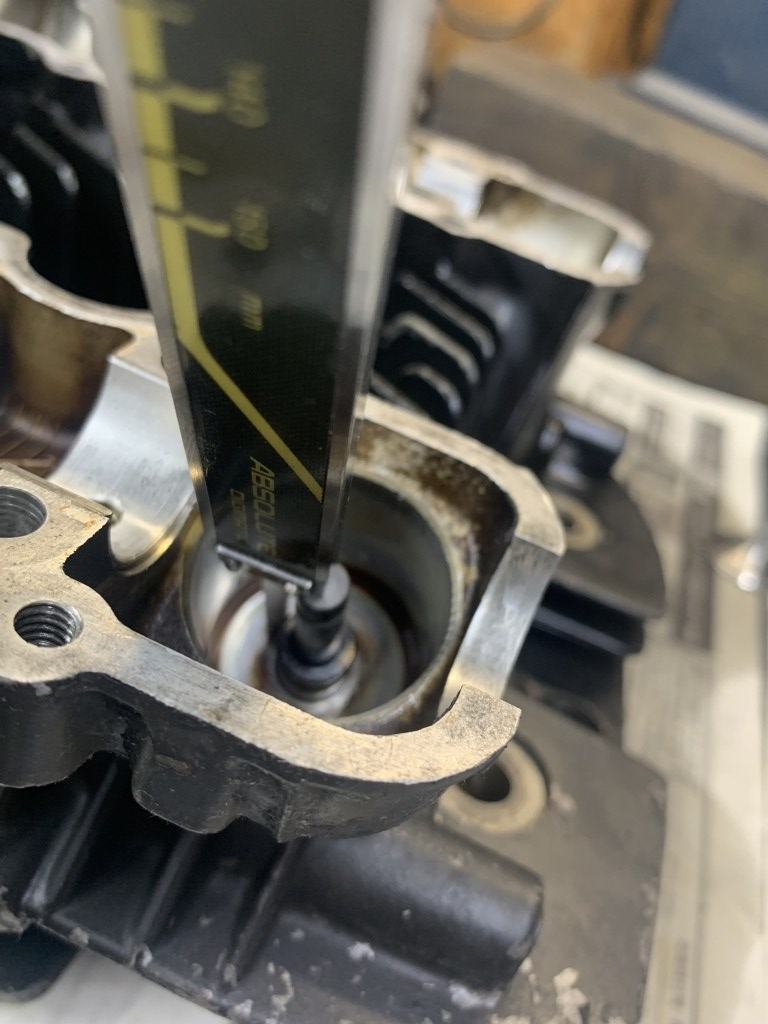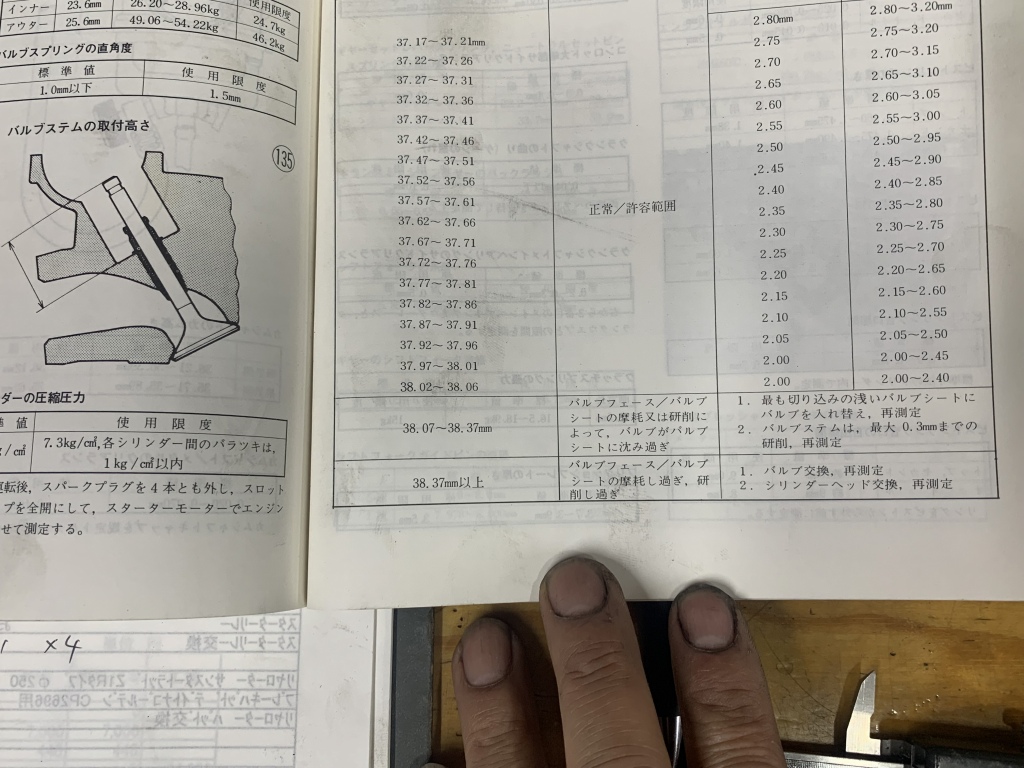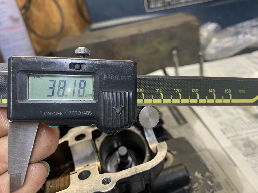 結果は約38.2ミリです。ステムエンドの最大研磨代は0.3ミリなので、純正シムでの調整は困難で、シートリングの入れ替えが必要です。