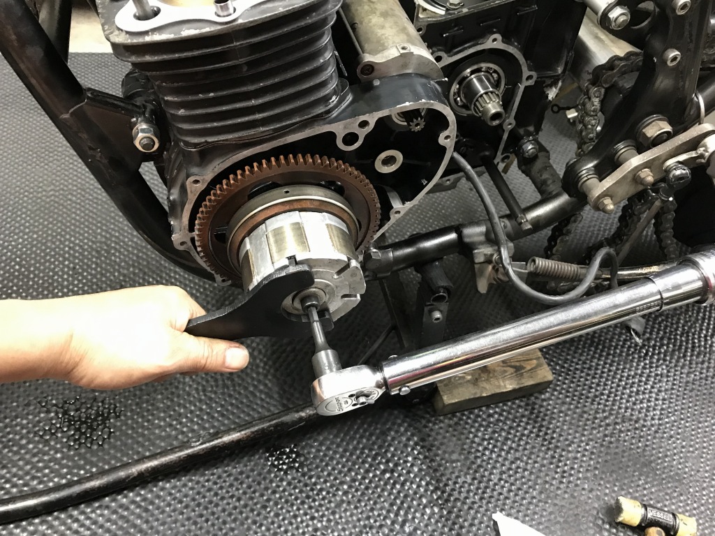 エンジン腰下組み立ての続きです。スタータークラッチの締め付けトルクを確認します。問題ありません。