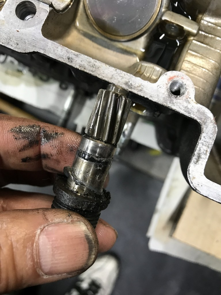 タコギヤを取り外します。Oリングはヘタり、ここも液体ガスケットで埋められていました。