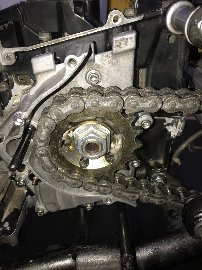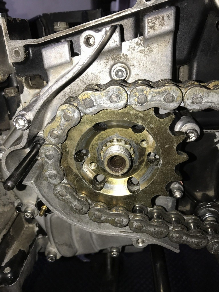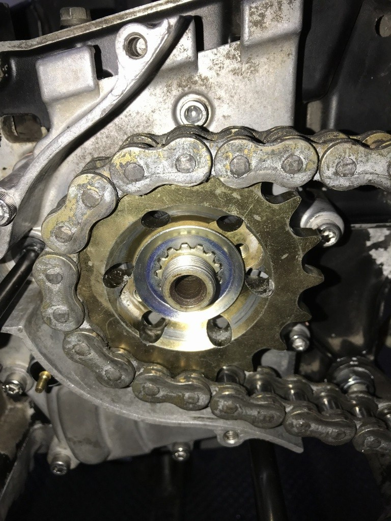 今回Mk2のアウトプットシャフトに交換したので、フロントスプロケの締結は信頼性一段と向上しました。スプラインも十分にかかります。