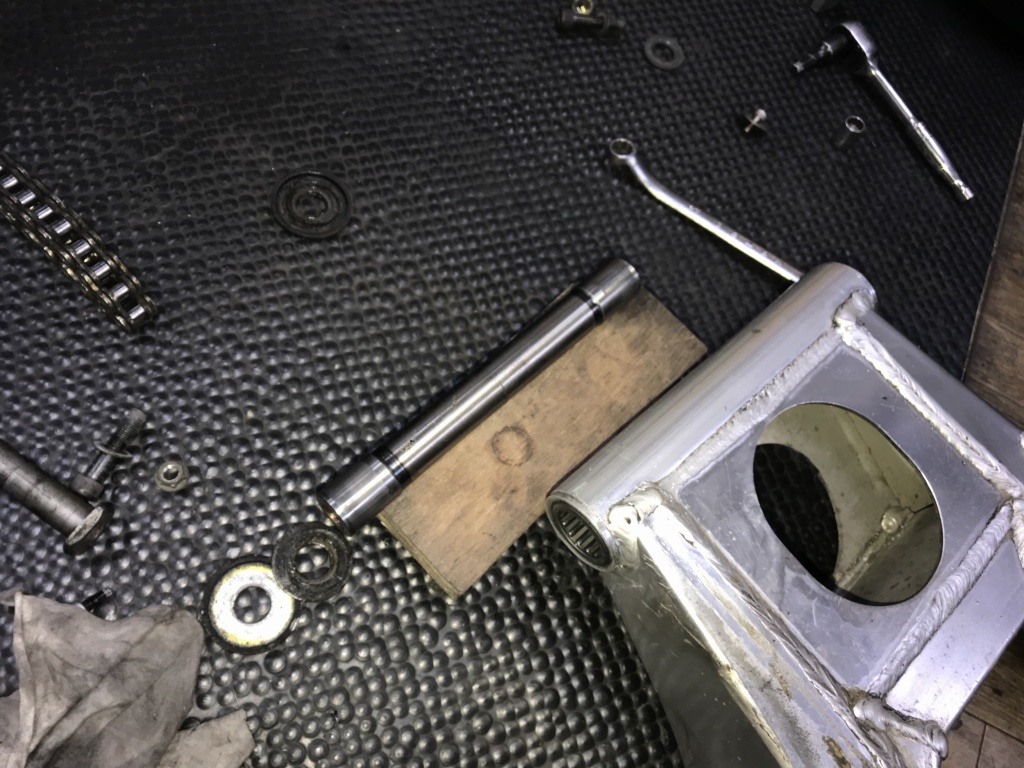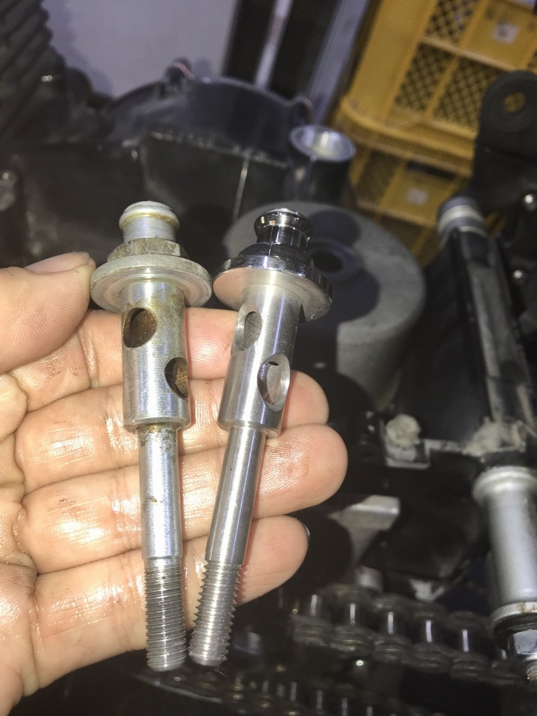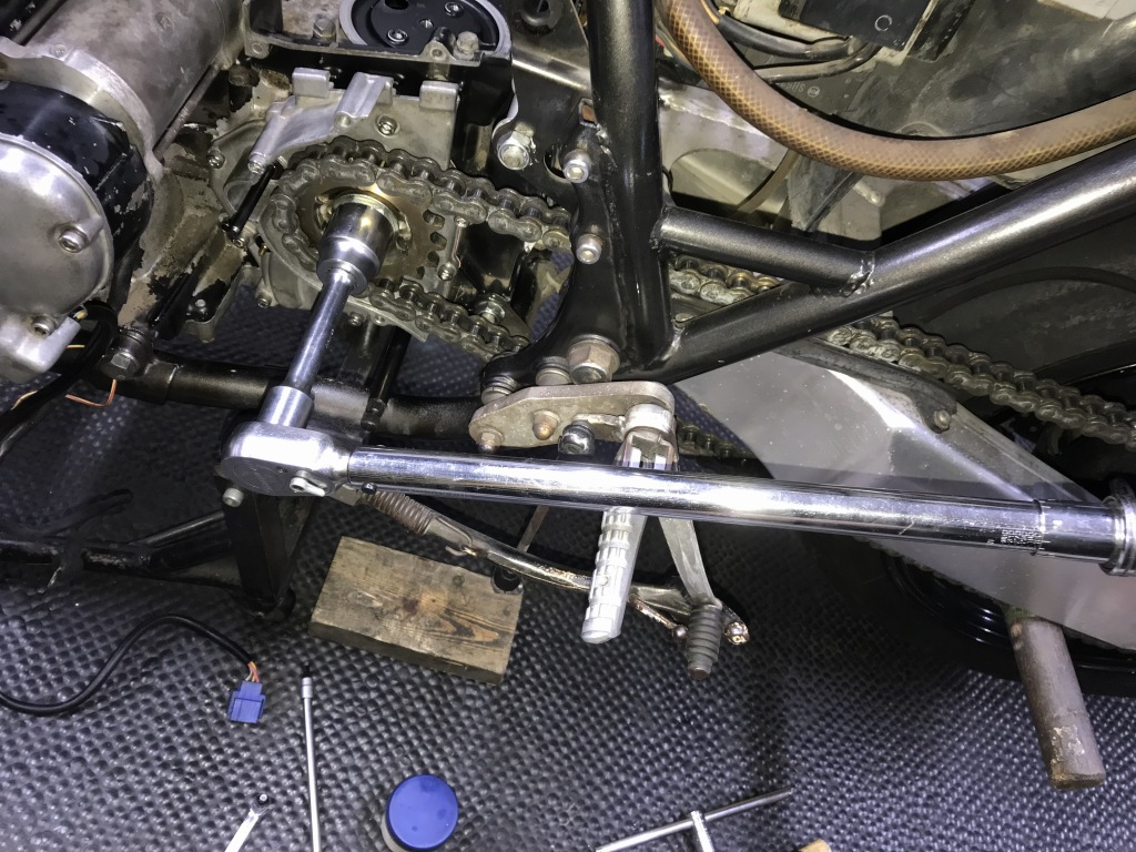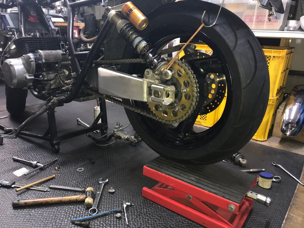 このまではチェーンが短すぎるので、チェーンはコマ数の多い物に交換することに。エンジンを脱着すると、若干エンジンは前に寄るのですが、それを考慮しても現在のチェーンは短いです。スイングアームの垂れ角の大きい車両は、チェーンの張り調整を間違い張り過ぎていると、3軸のベアリングの破損に繋がるので要注意です。
