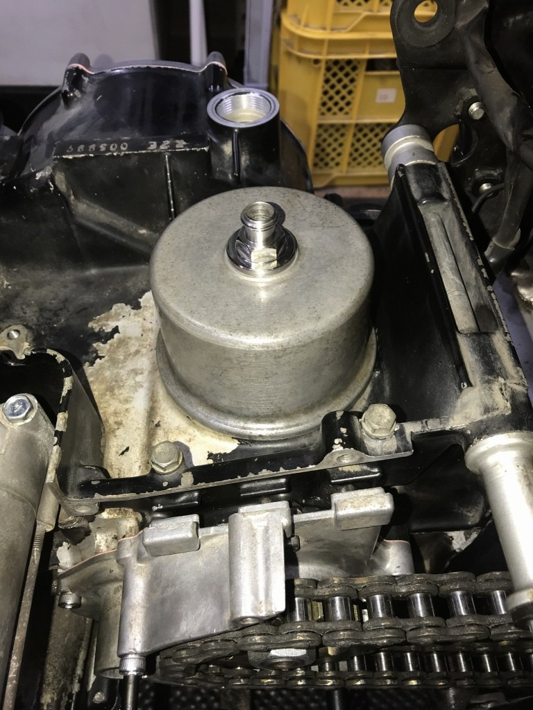 ミッションカバーを取り付け、既存のフロントスプロケを取り付けます。