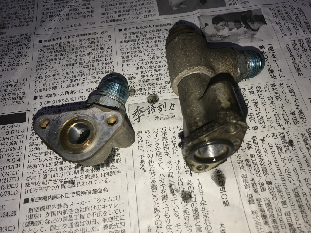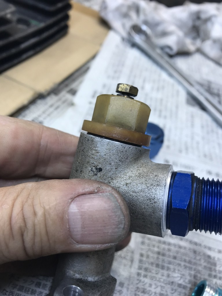 ニップルは一部ネジがかじっていたので交換します。ニップルのシールは、座面が平面なのでアルミのガスケットのみで十分です。