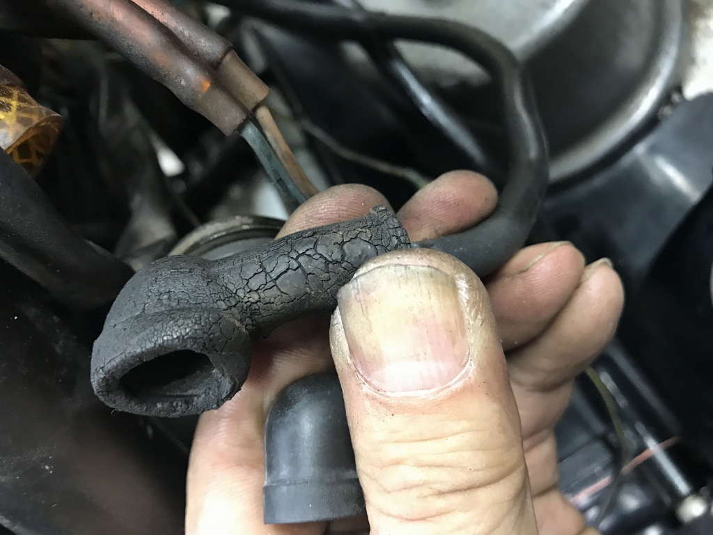 スターターケーブルのターミナルカバーは劣化してボロボロです。