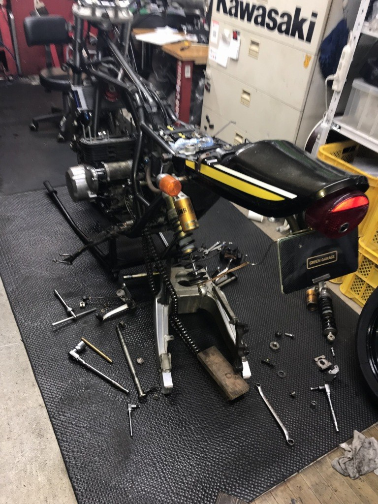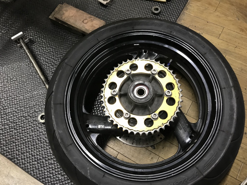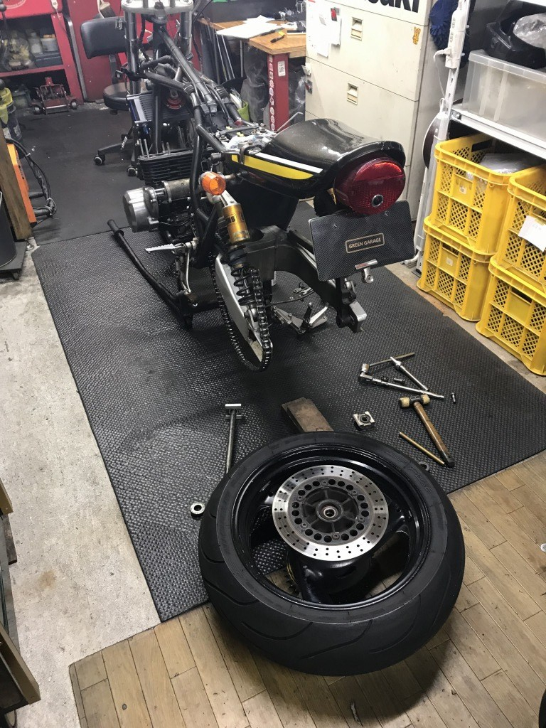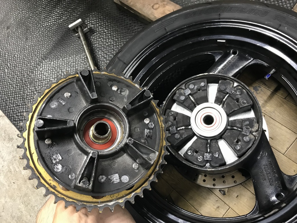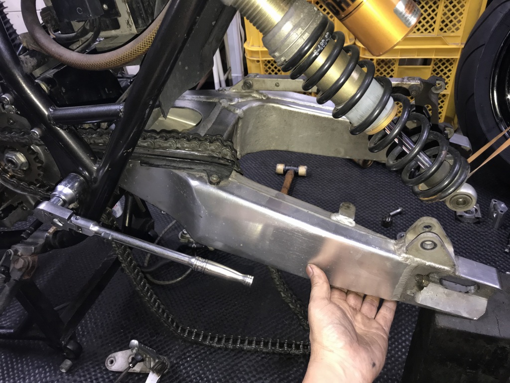 続いてリヤ周り。スイングアームを外して点検します。