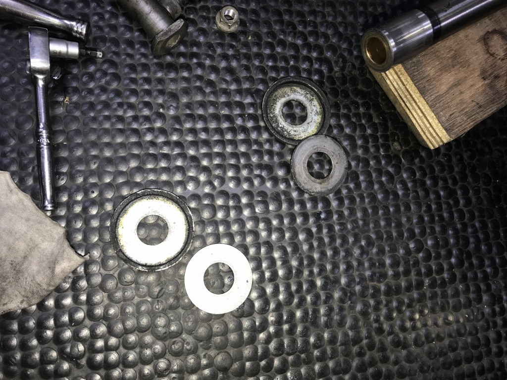 リヤショックのアッパーマウントは、薄いワッシャーを使っているので変形しています。これは剛性のあるワッシャーに交換が必要です。