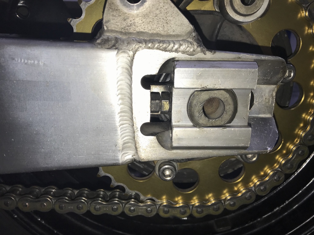 スイングアームを締め付け後、垂れ角が大きいのでチェーンの張り具合をチェックします。リヤホイールを持ち上げて、アウトプットシャフト、ピボットシャフト、リヤアクスルシャフトの3軸を一直線上に並べます。この状態が軸間が最も離れる状態です。ここでチェーンの遊びが極少になるよう調整します。すると、チェーンアジャスターは一番前なのに、チェーンが突っ張ってしまい、スイングアームが上がりません。