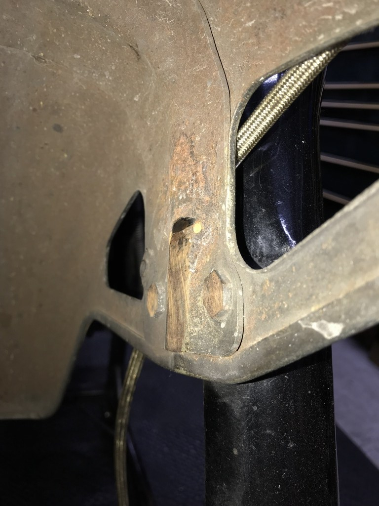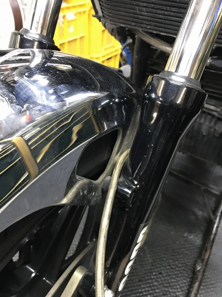 ブレーキホースはフェンダーとフォークの間を通っており抜けません。通常はここに隙間はほとんどないはずです。