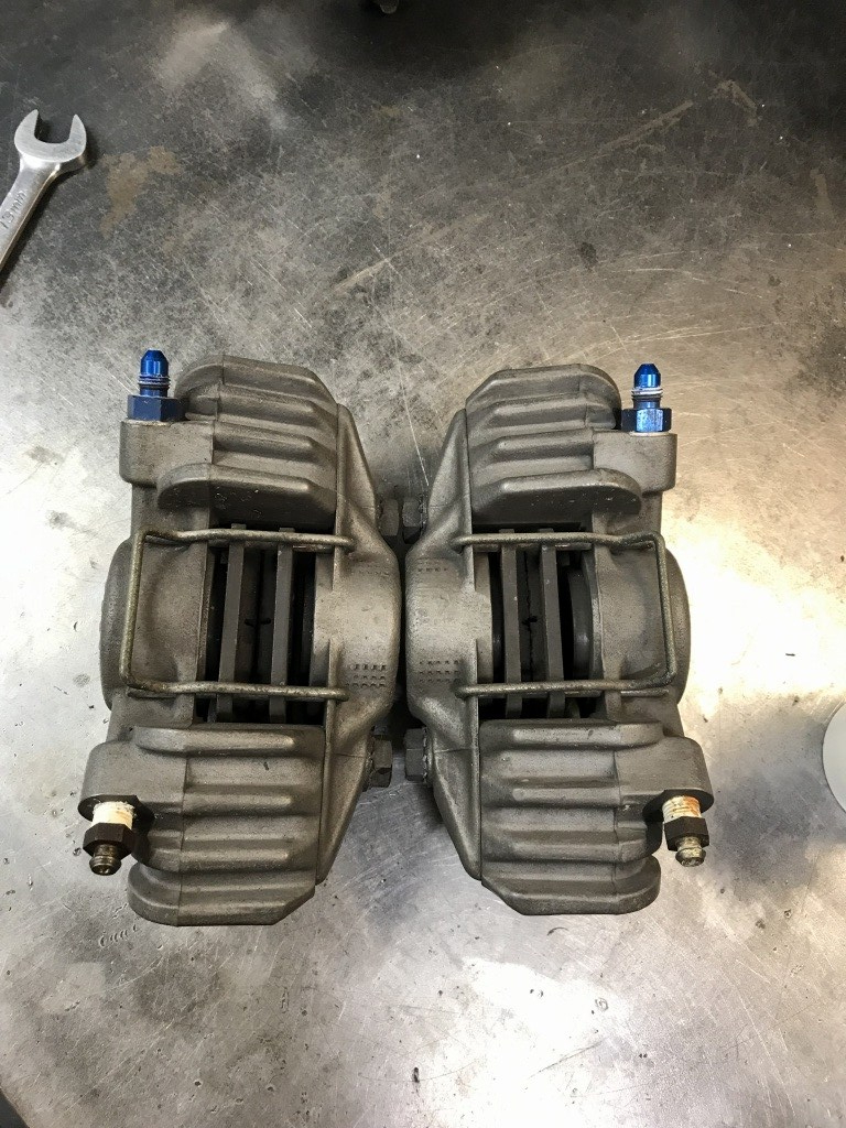 フロントキャリパーを外します。ブリーザーに不要なシールテープが巻いてあります。ブリーザーの位置も適切ではないので合わせて修正します。