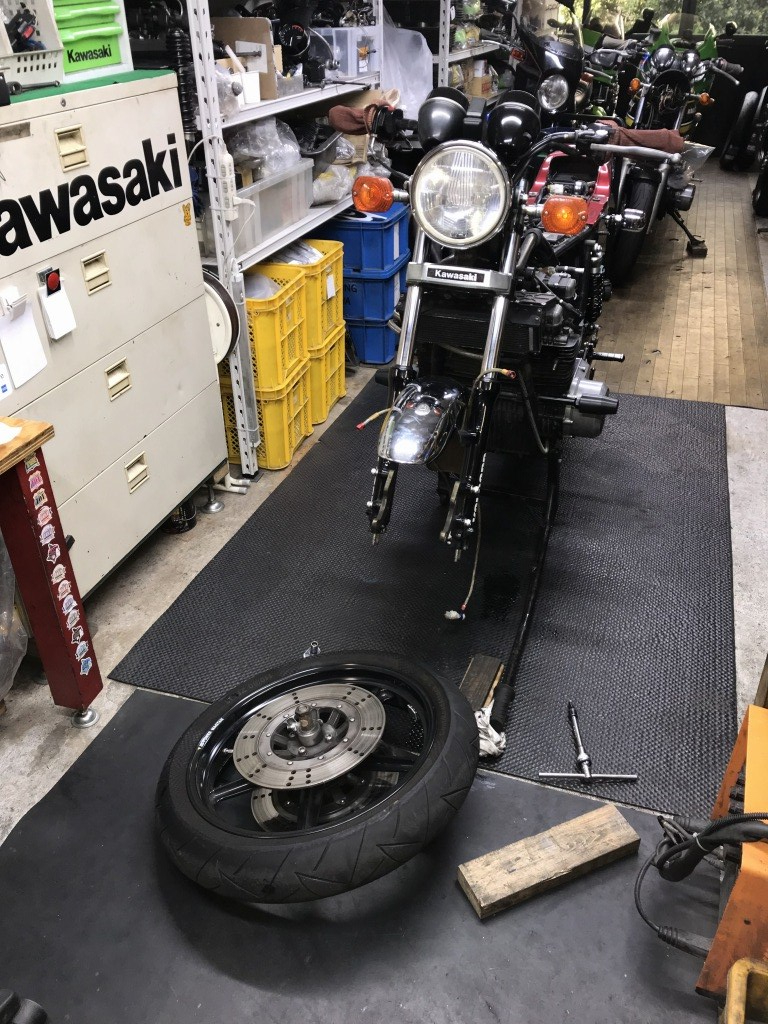 参考までにMk2と同じフォークのZ1Rはこんな感じ。ボスが短いのが解ります。Mk2ともどもフェンダー内幅が広いので、通常は110/80-18タイヤを装着してもほとんど干渉しないものです。
