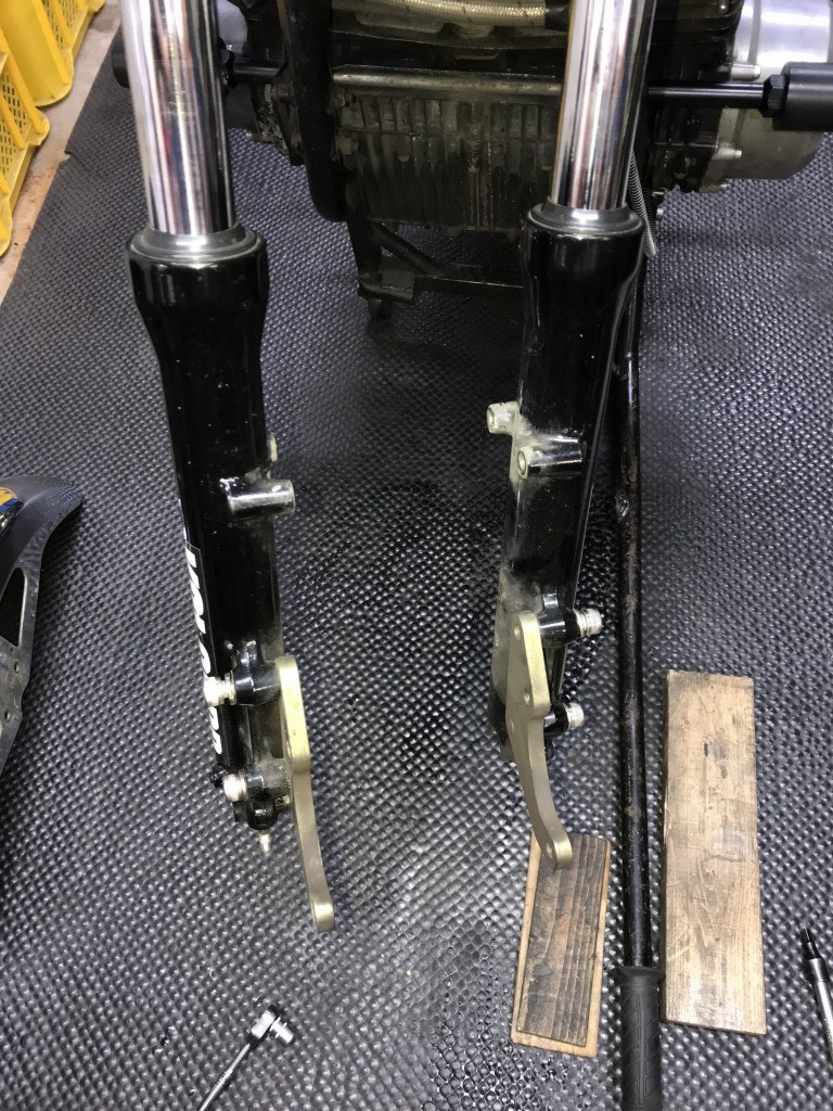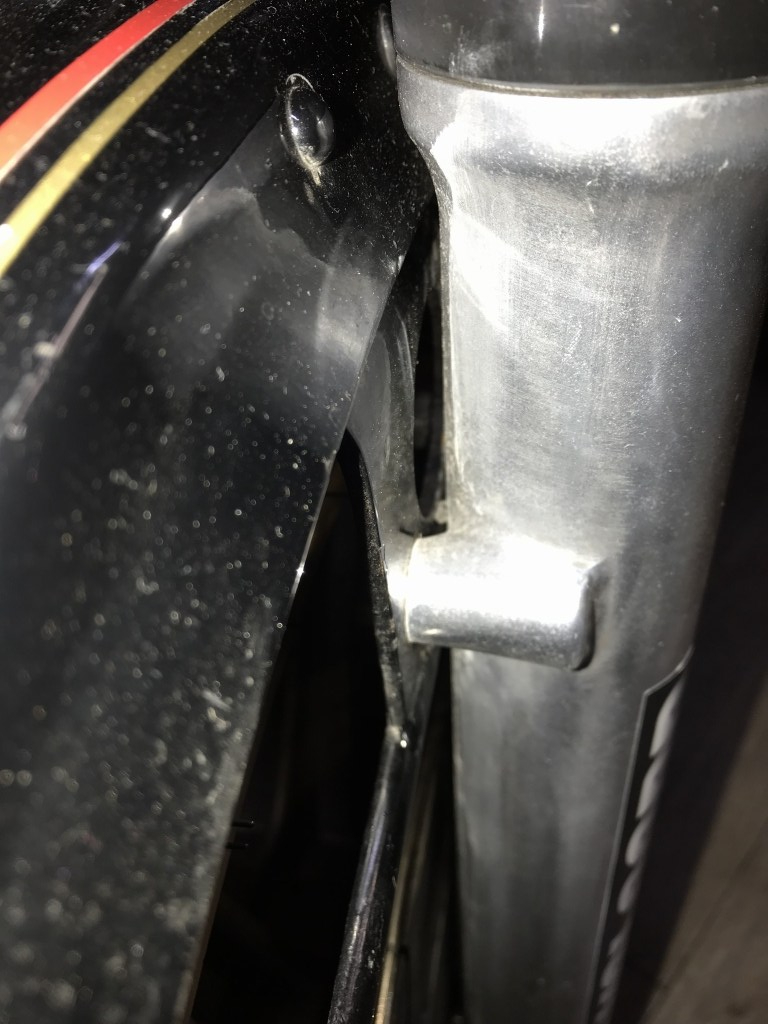 フェンダーを外してみると、フォークがMk2用でないことが解りました。フェンダーの取り付けボスが長い、Z1000などのスポークホイール車用のフォークです。フェンダーは幅を狭くして付けてあったようです。ボスは少し切断し、Mk2と同じ長さにした方がいいでしょう。
