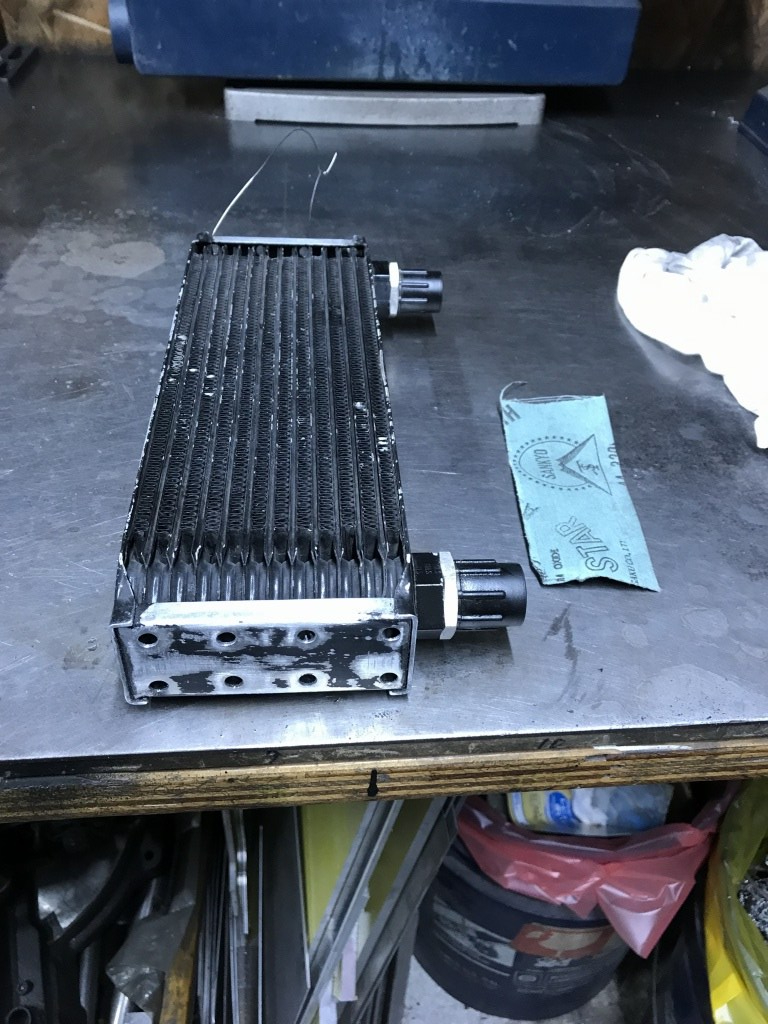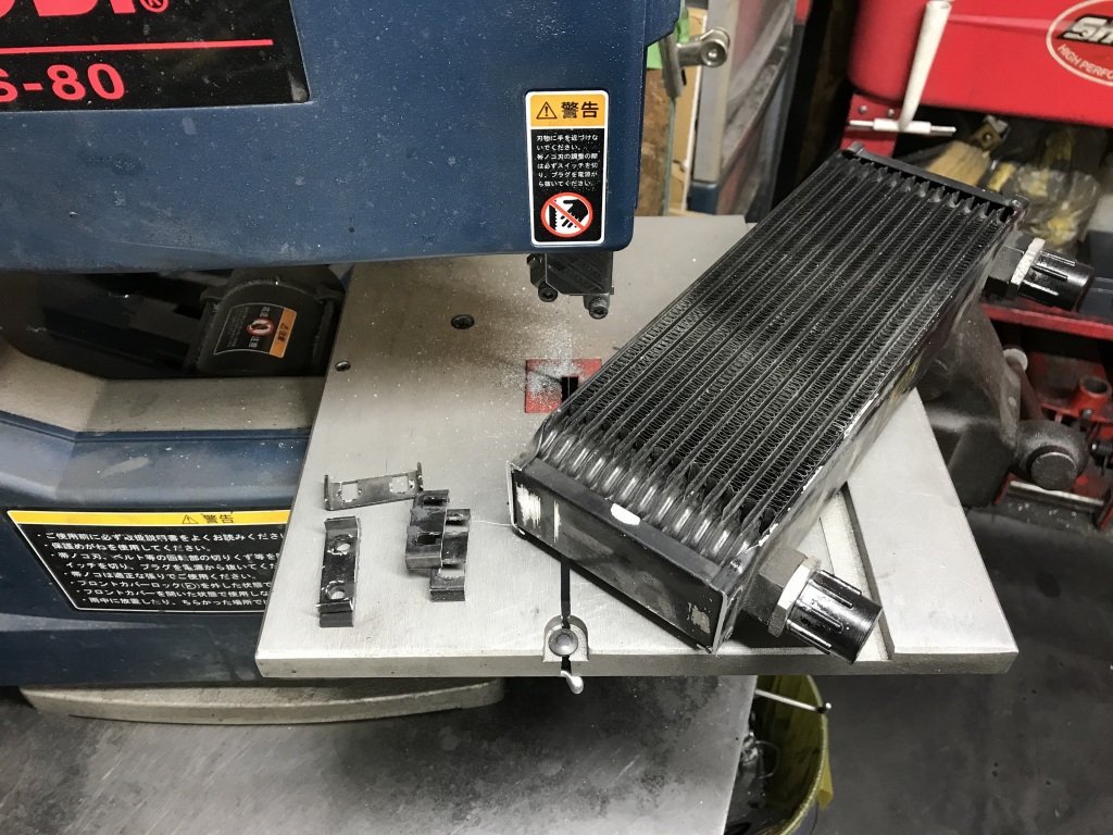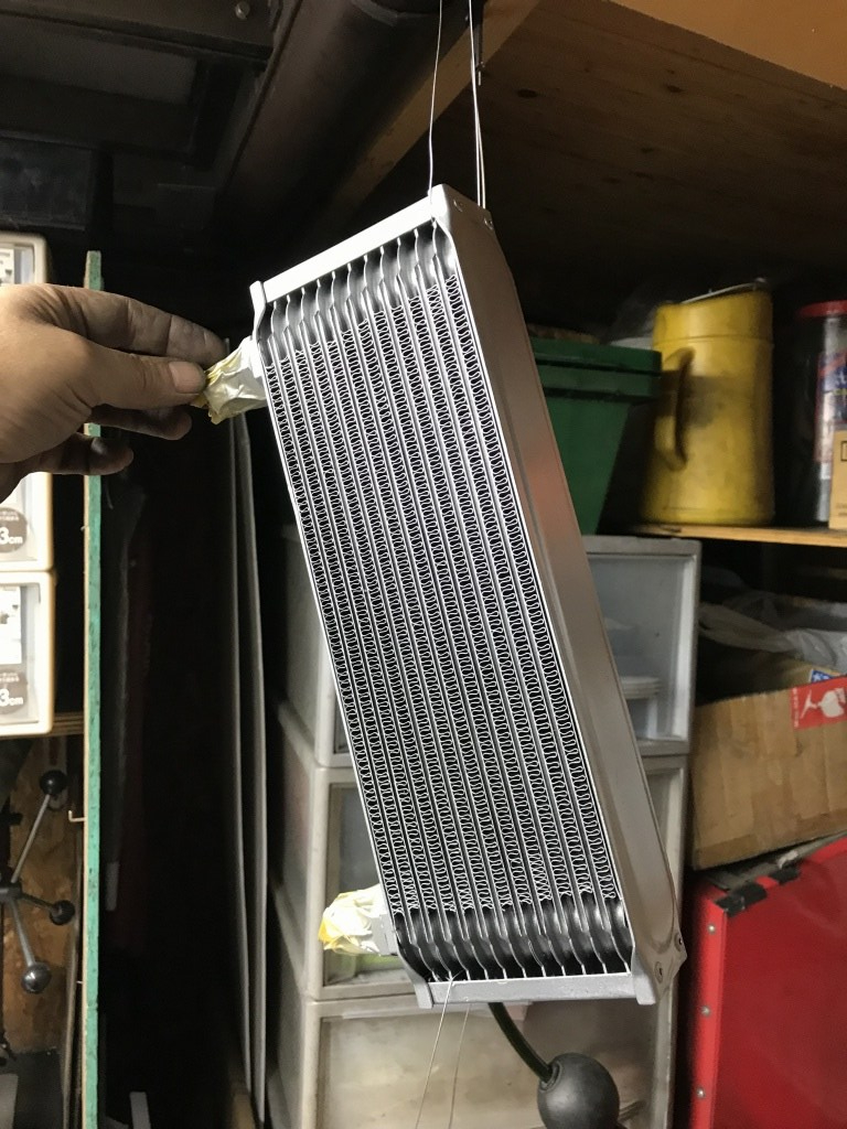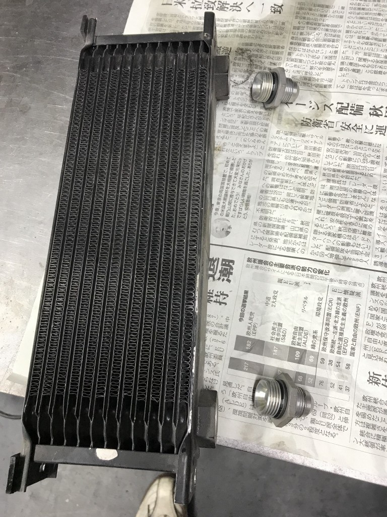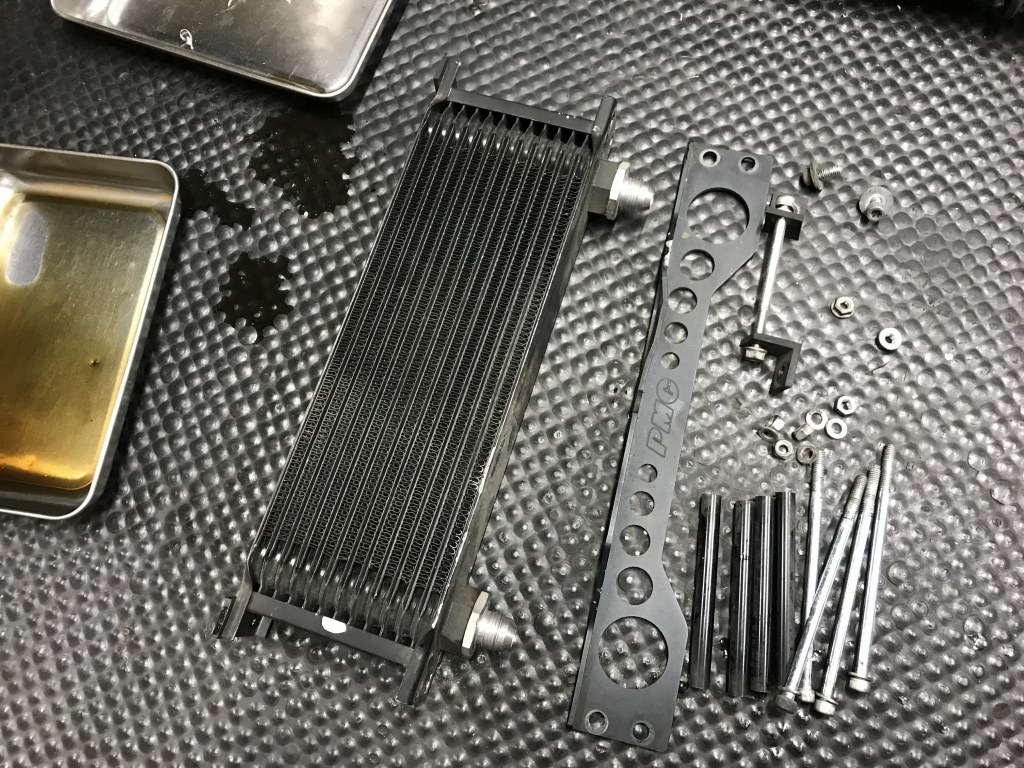 オイルクーラーは垂直マウントのワークスタイプに変更します。先ず、既存のオイルクーラーを外します。
