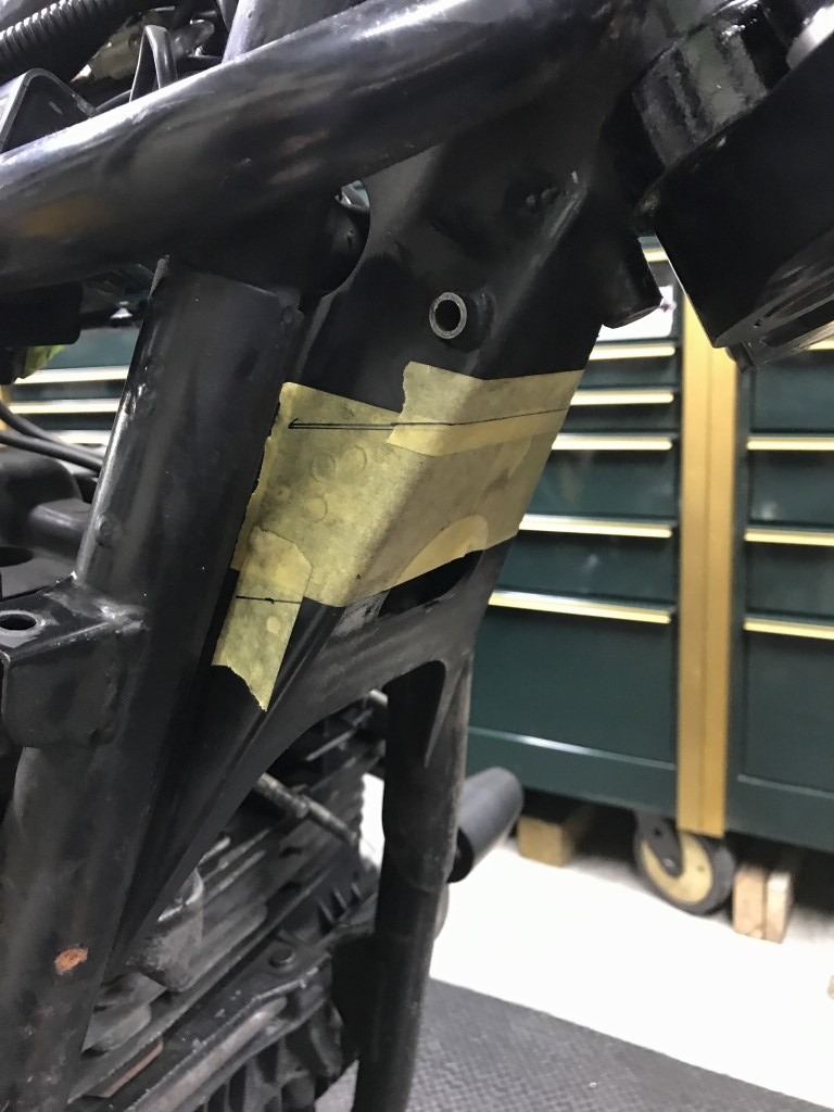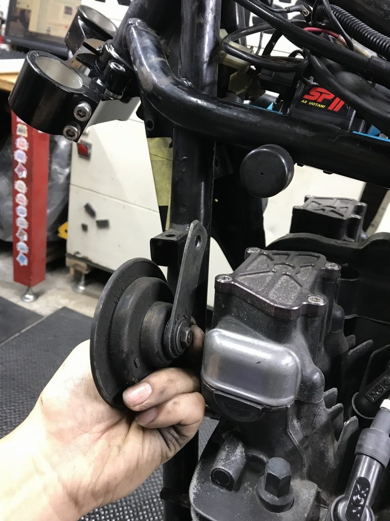 続いて、垂直マウント用にフレームのガセットをカットします。ノーマルのホーンは付かなくなるので外します。