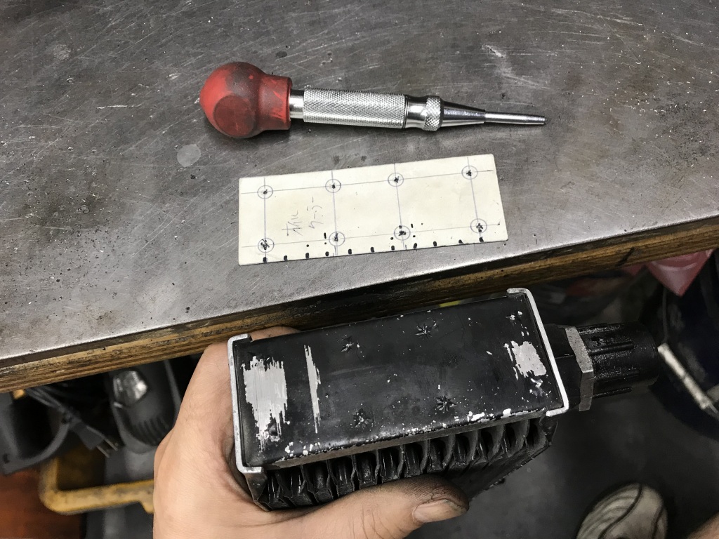 当時風にするため、コアのサイドに穴開けします。先ずは型紙に合わせて弱くポンチを打ちます。