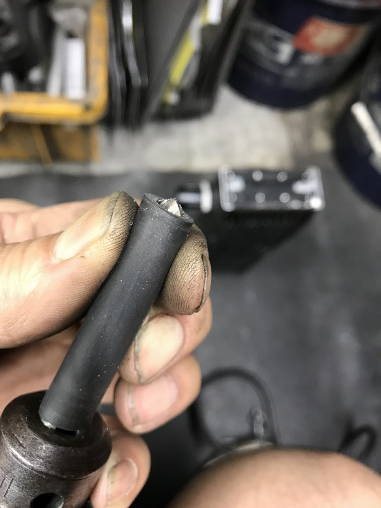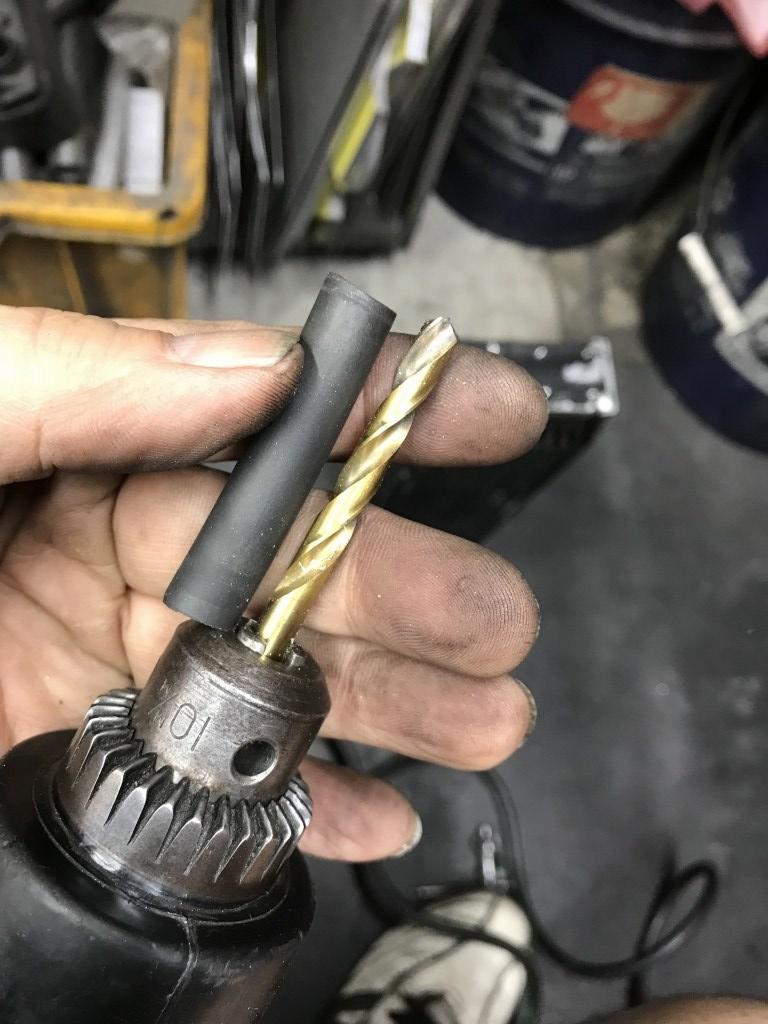 穴開け用のドリルは先端を一文字加工した物を使います。ゴムホースで作ったガイドをはめて突き抜け量を制限します。