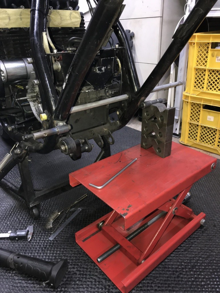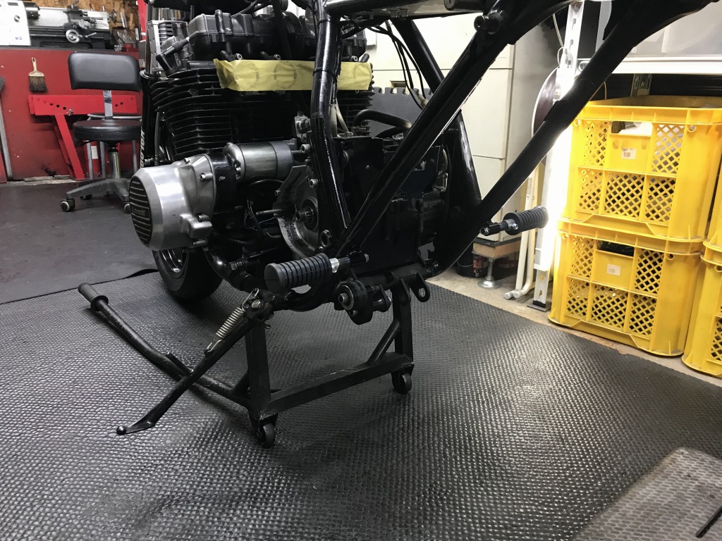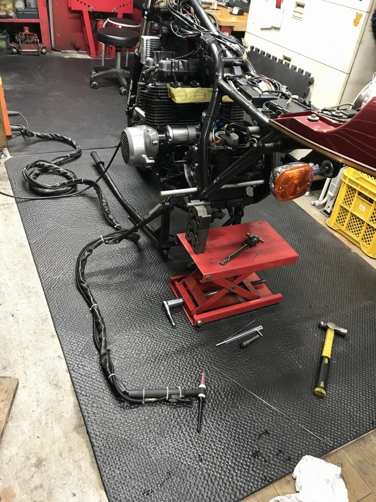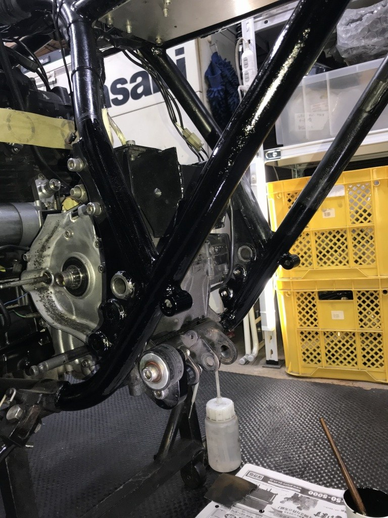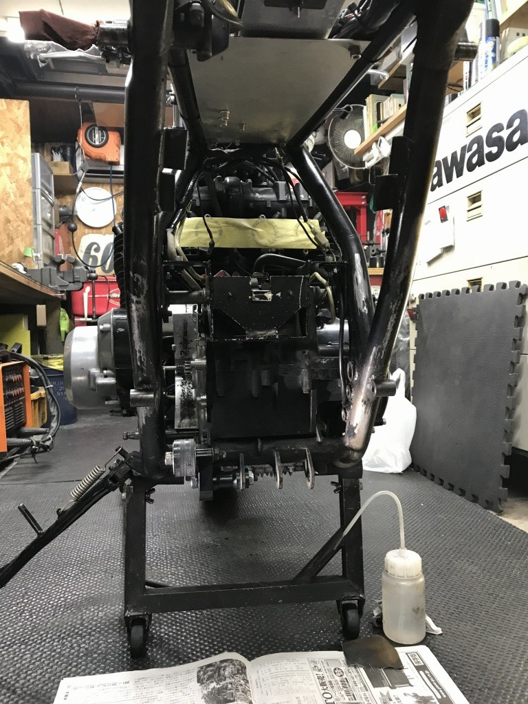 ステップはワークスバックステップVer.2に変更します。ステップはフレーム直付けになるので、ボスをフレームに溶接します。作業はスイングアームまでを外して行います。
