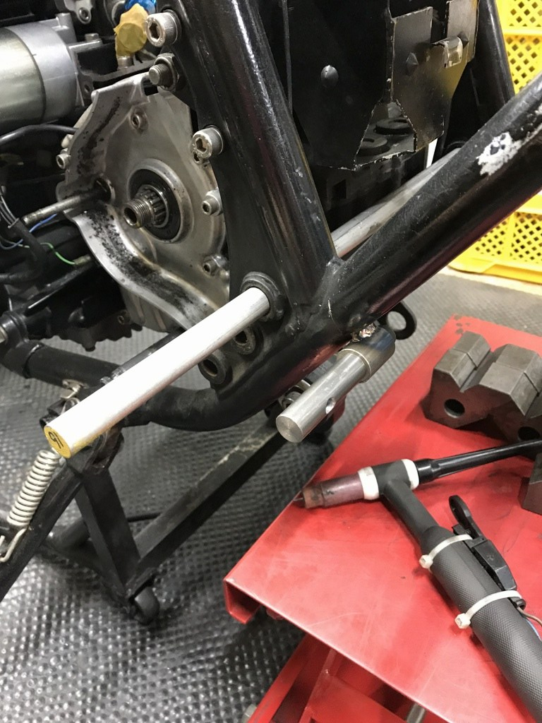 スイングアームピボットに通したシャフトを基準に平行に溶接します。
