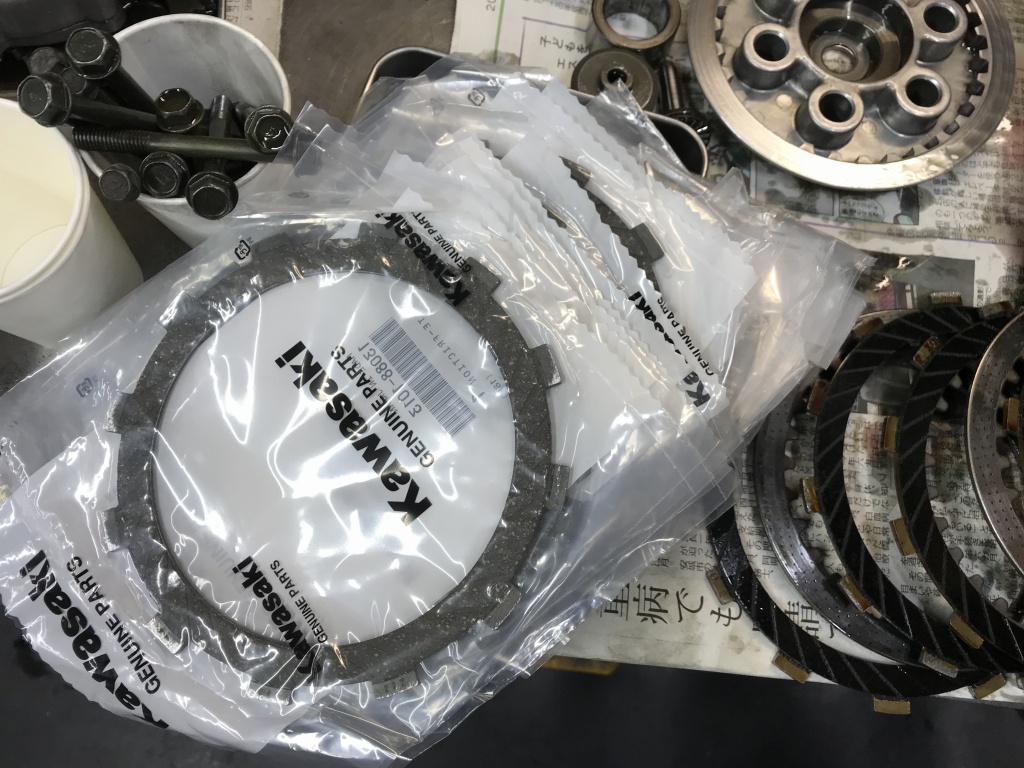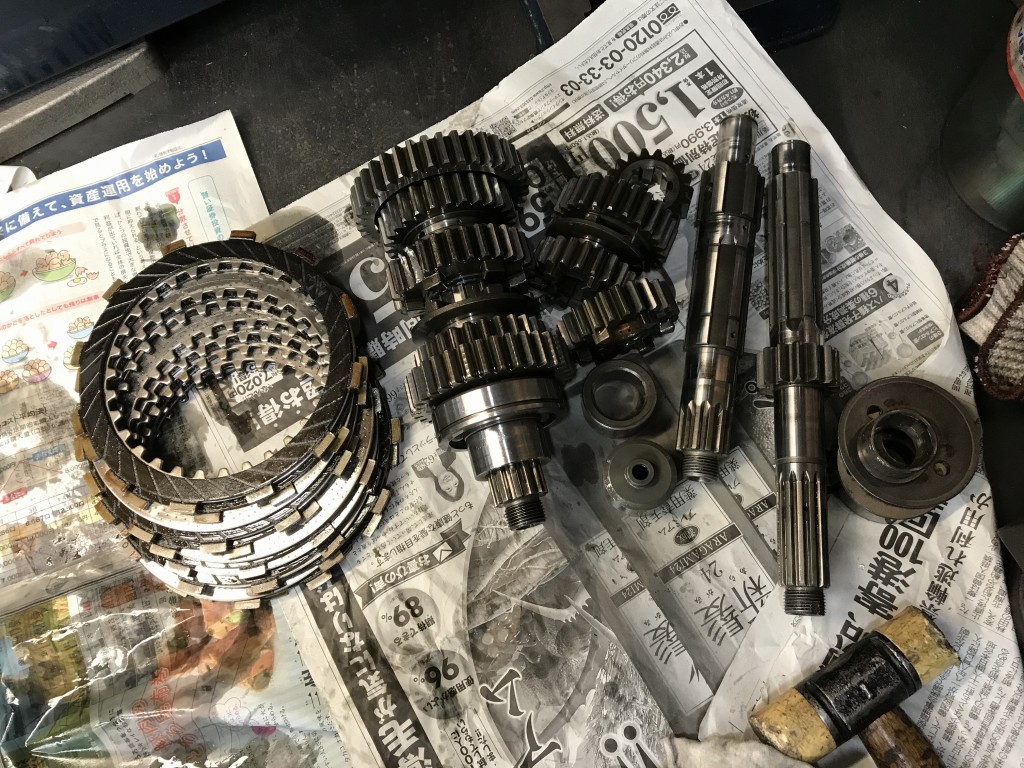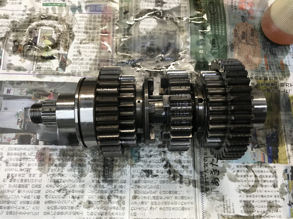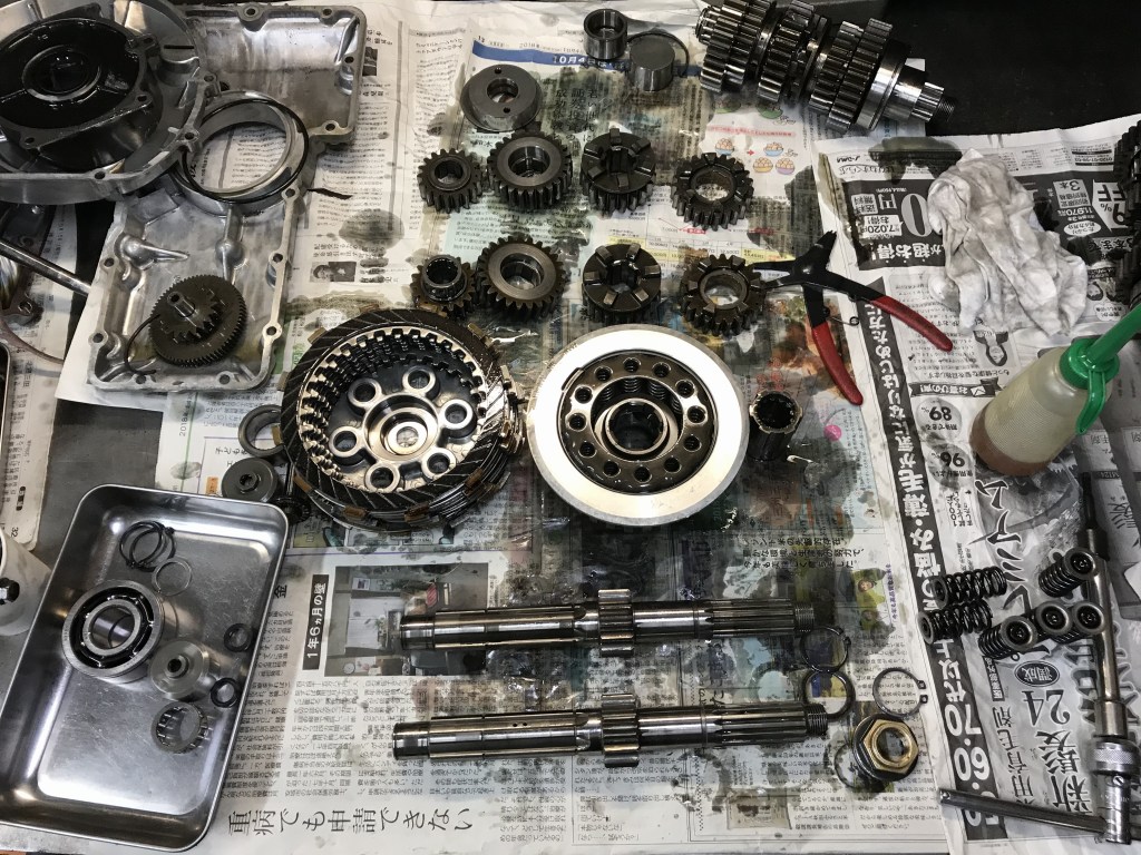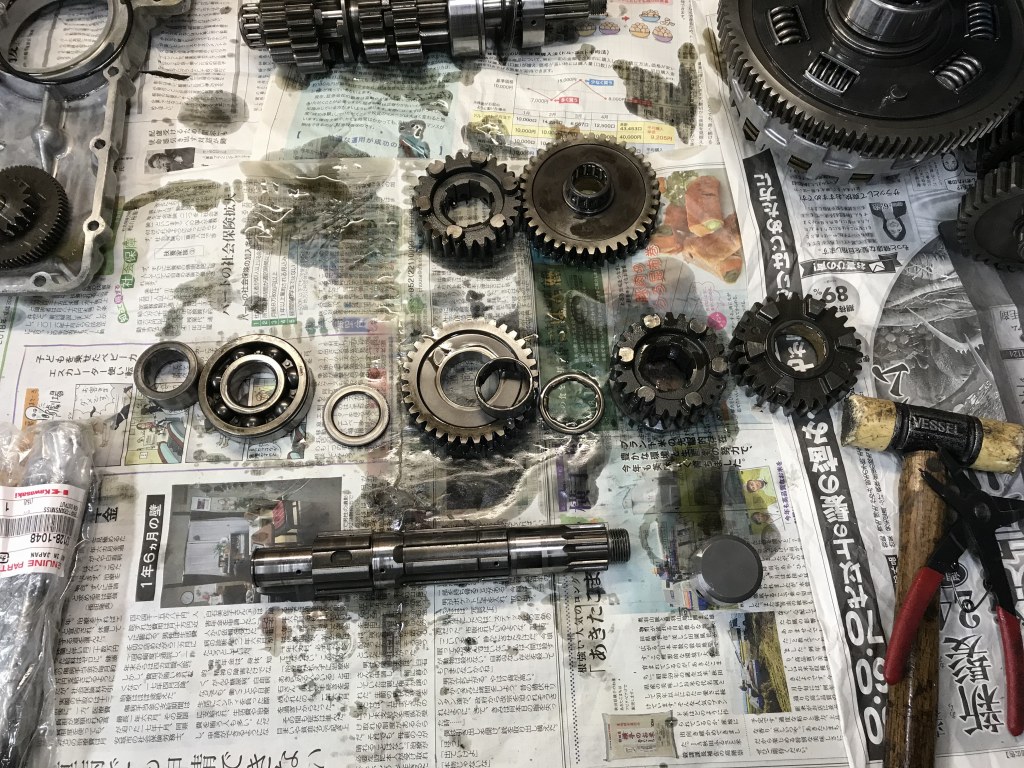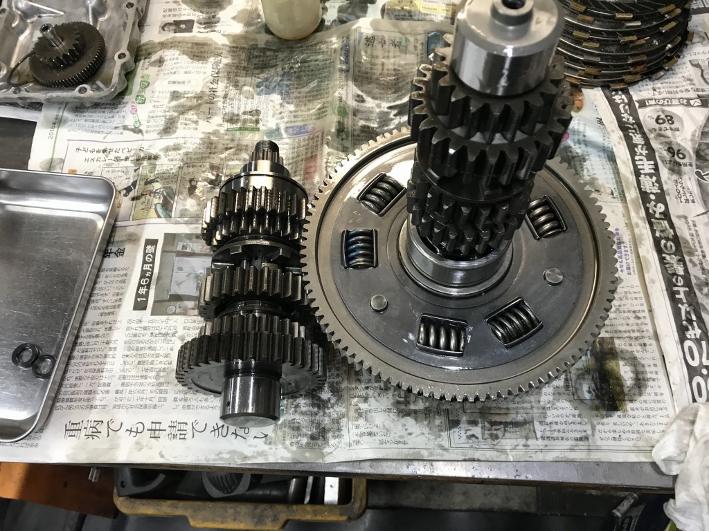 ミッションは、どちらも同じGPZ1100の物なので、クラッチ関係は移植して継続使用します。ギヤは他のギヤも疲労していると思われるので、全部交換します。