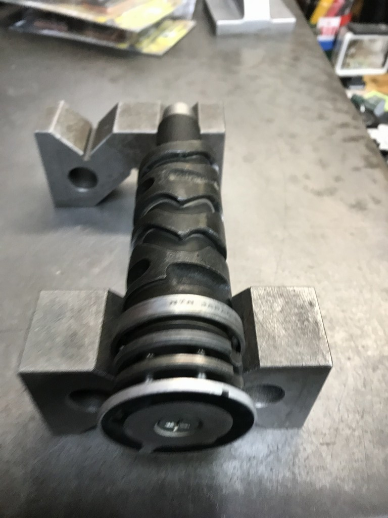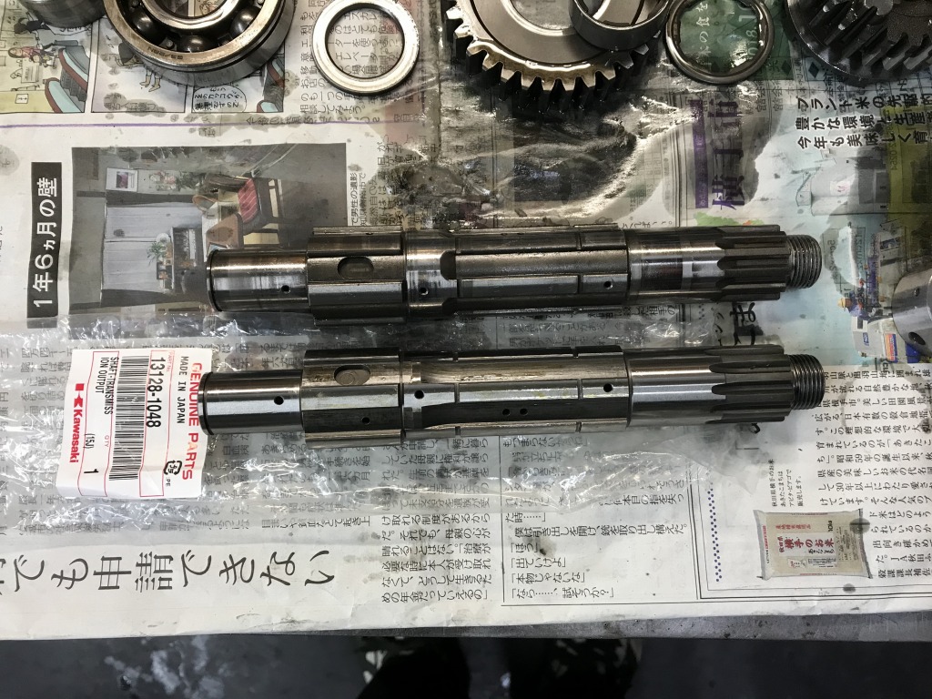 シャフトは少し摩耗しており、スプラインも消耗があるので、アウトプットシャフトも下側の新品に交換することにします。