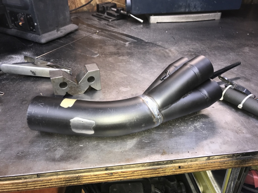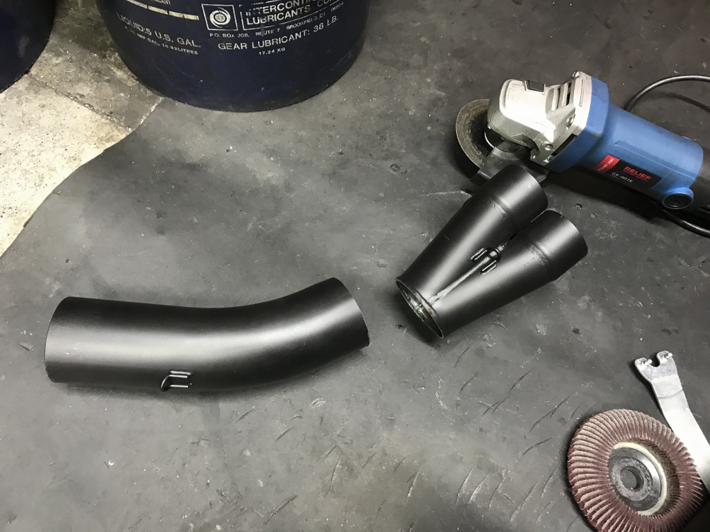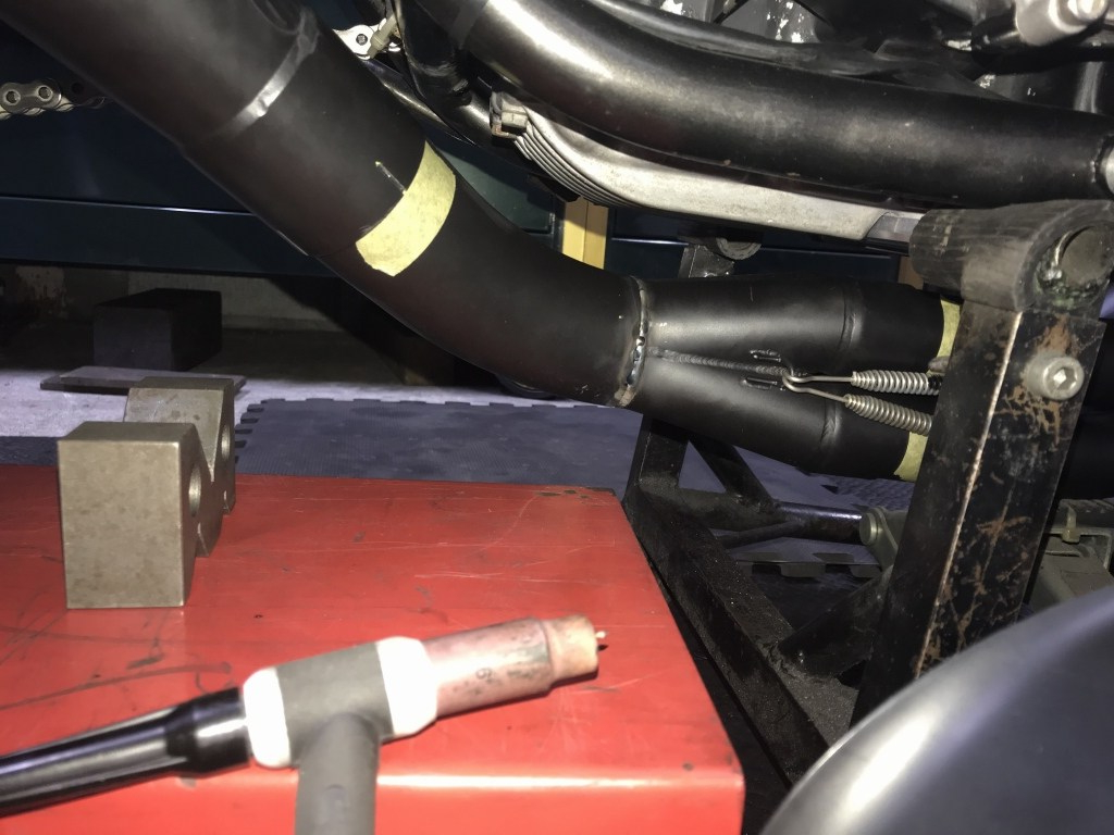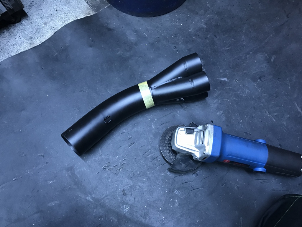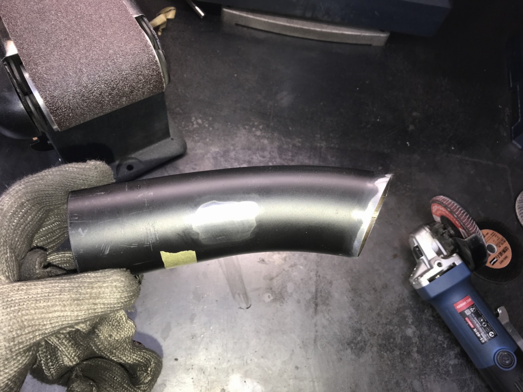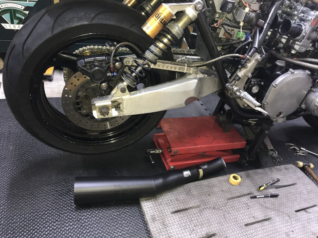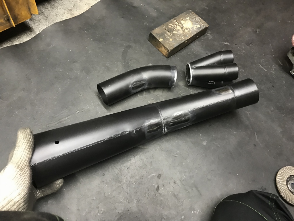 続いてマフラーのカチ上げ加工です。素材はPMC製S1タイプメガホンです。集合部直後で切断して向きを変えます。