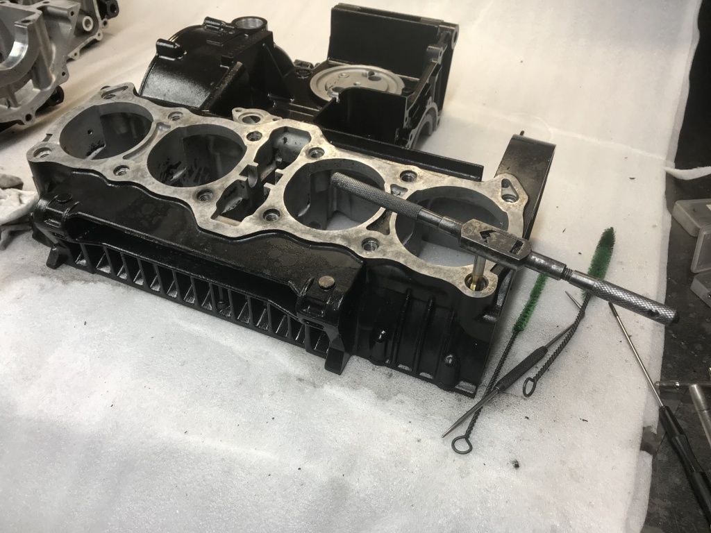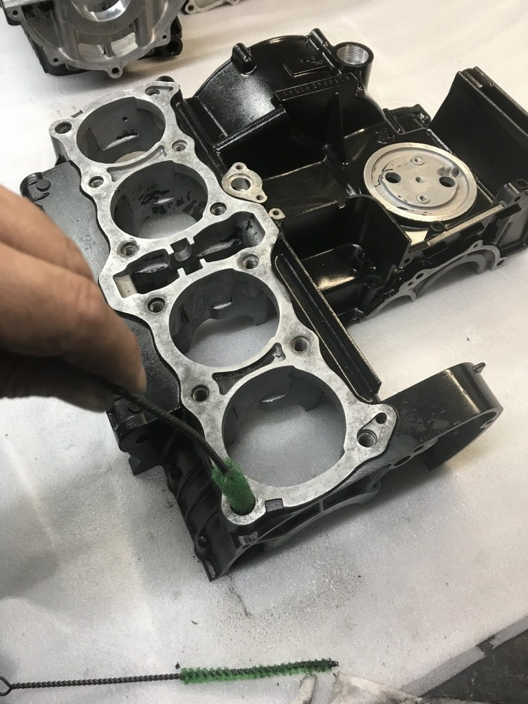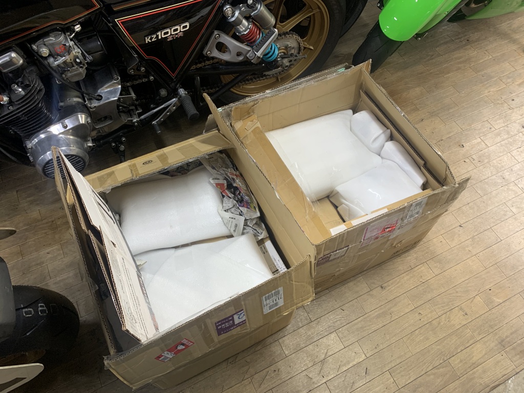 梱包を解いて点検します。 ブラック部分は全てセラコートを施工しています。 オイルパンなどはウエットブラストのみ、純正で光沢のある分はバフ掛けしています。