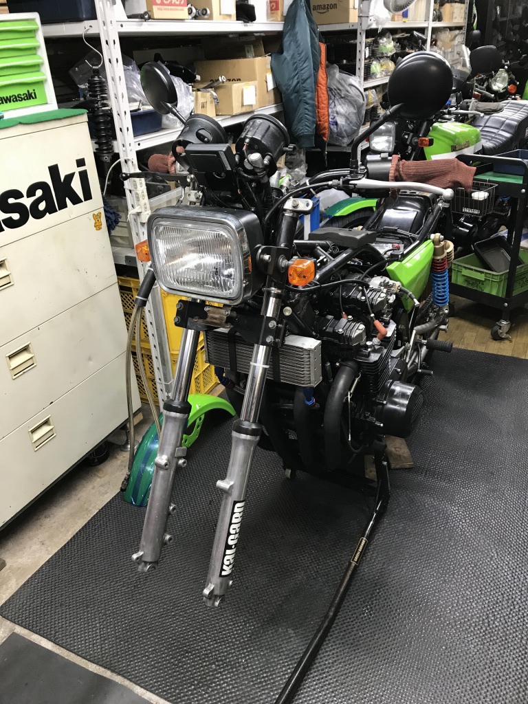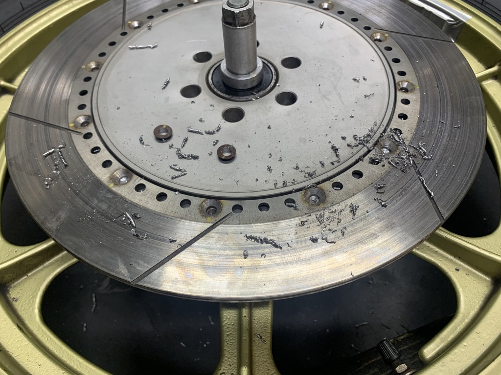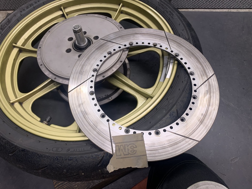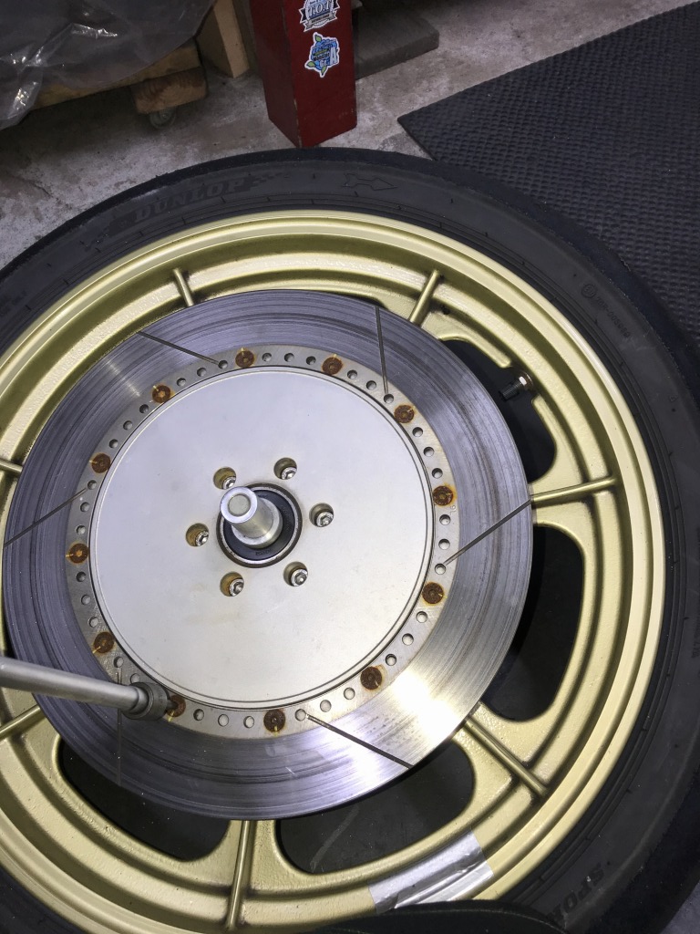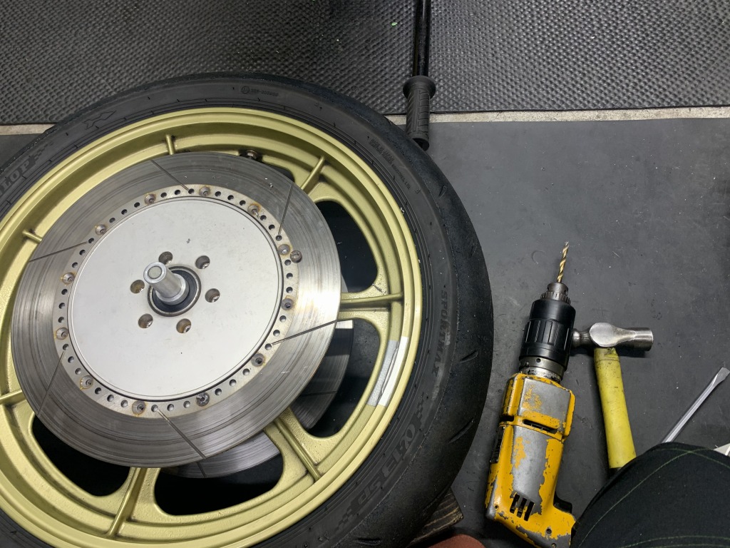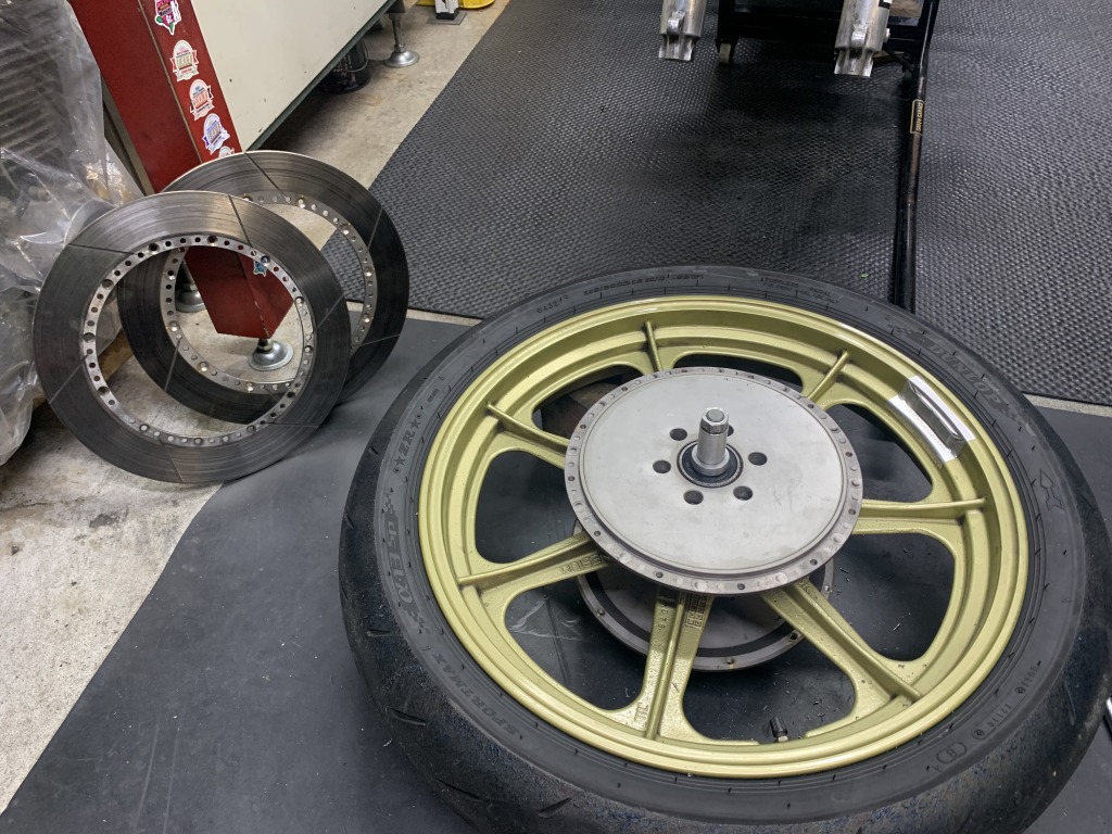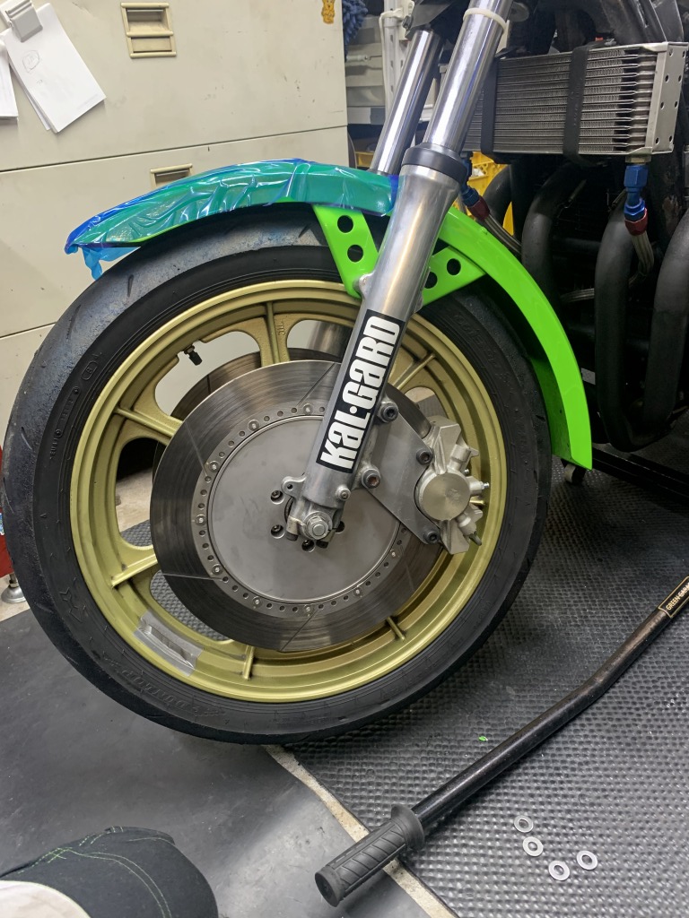 ホイールを取り付けたら仮のブラケットでS1キャリパーを仮組します。元のブレーキホースはちょっと届かないので作り直しになる予定。