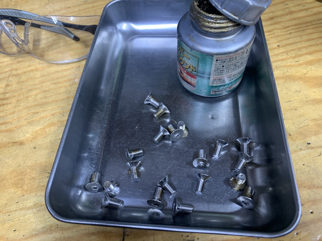 ステンレス皿キャップボルトは、クロモリ製より更に舐め易いので要注意。皿キャップボルトは数回脱着したら新品交換をお勧めします。