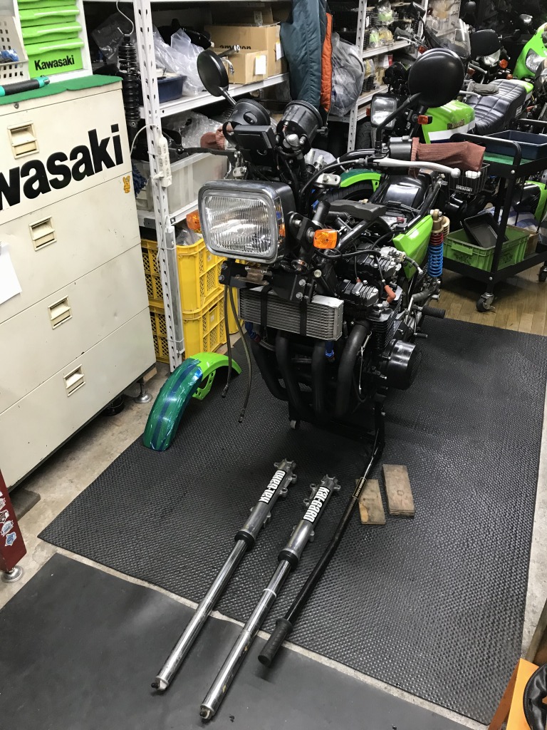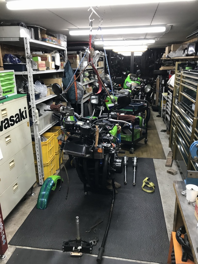 ハンドルとメーター周りを釣り上げながら上下ステムを外します。