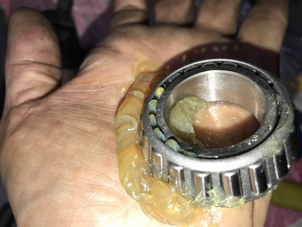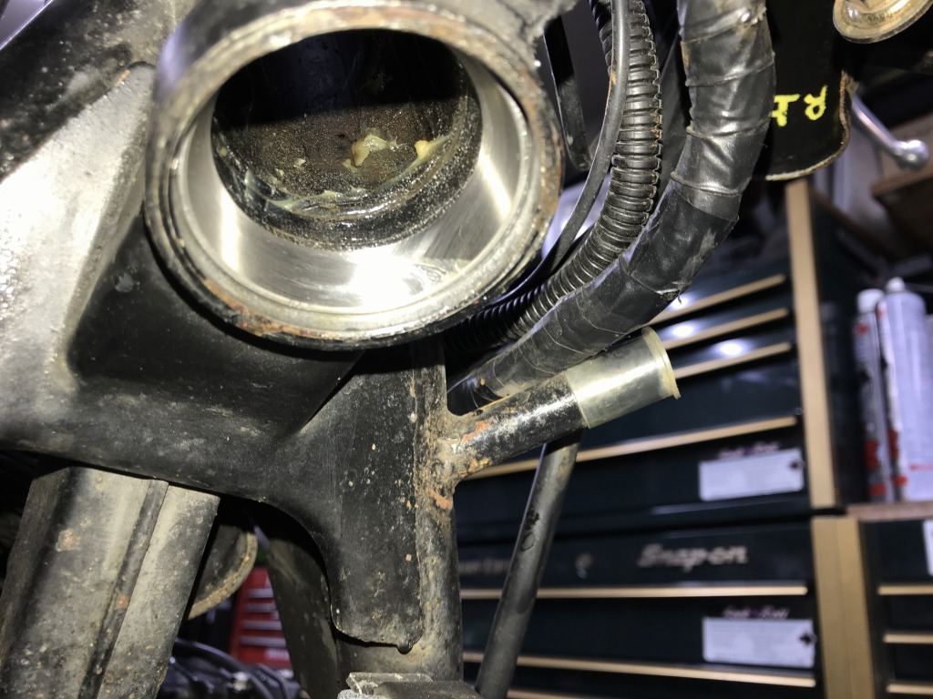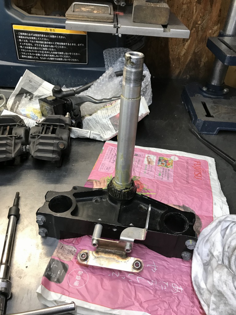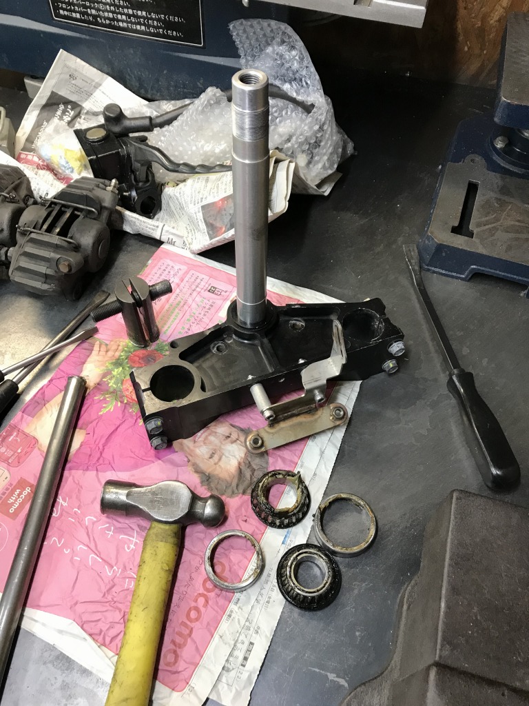 ステムベアリングを外します。下側はシール付きなので社外品のようです。
