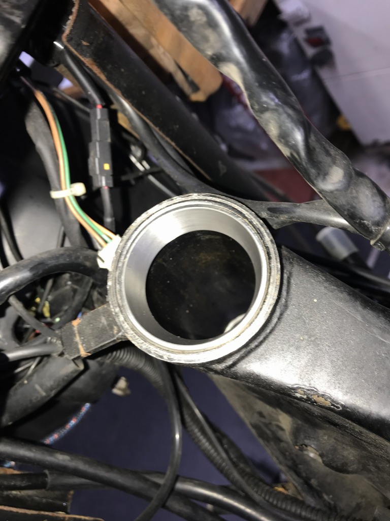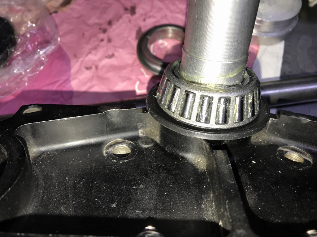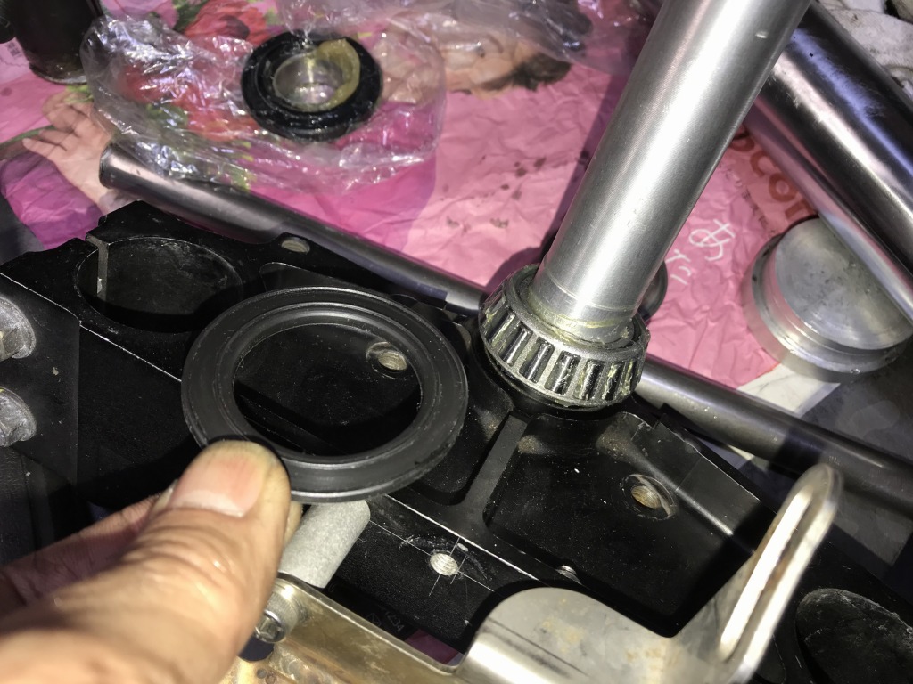 ロアステムにベアリングを圧入し、純正には無いダストシールとしてタンクキャップのパッキンを流用します。