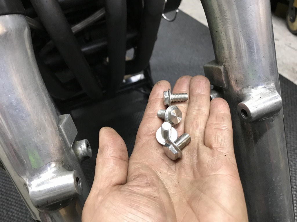 タイヤが抜けにくかったので、フェンダーのボルトは削って作った低頭のフランジボルトに変更します。