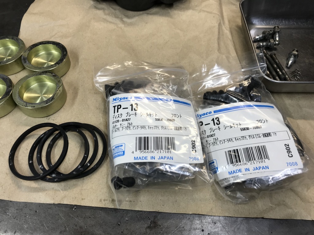 シールは変形やキズがあったので交換します。S1キャリパー純正品は予備が無いので、代用品としてミヤコ自動車製のアルトなど用シールキットTP-13を使います。