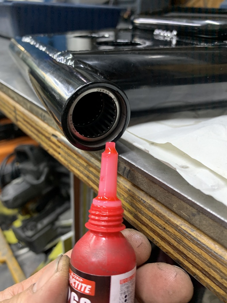 塗装が終わったスイングアームにベアリングを挿入します。少し緩いのでロックタイトを併用します。