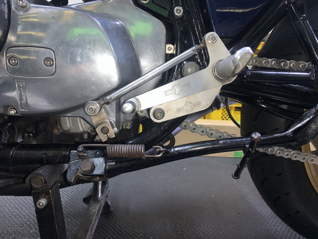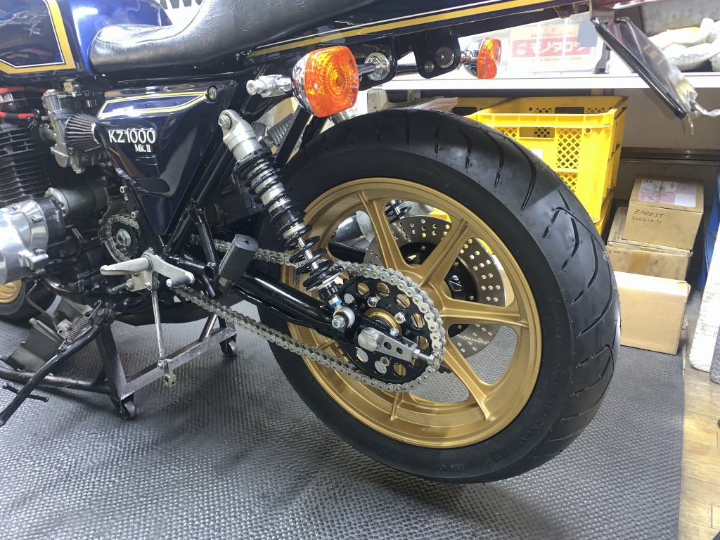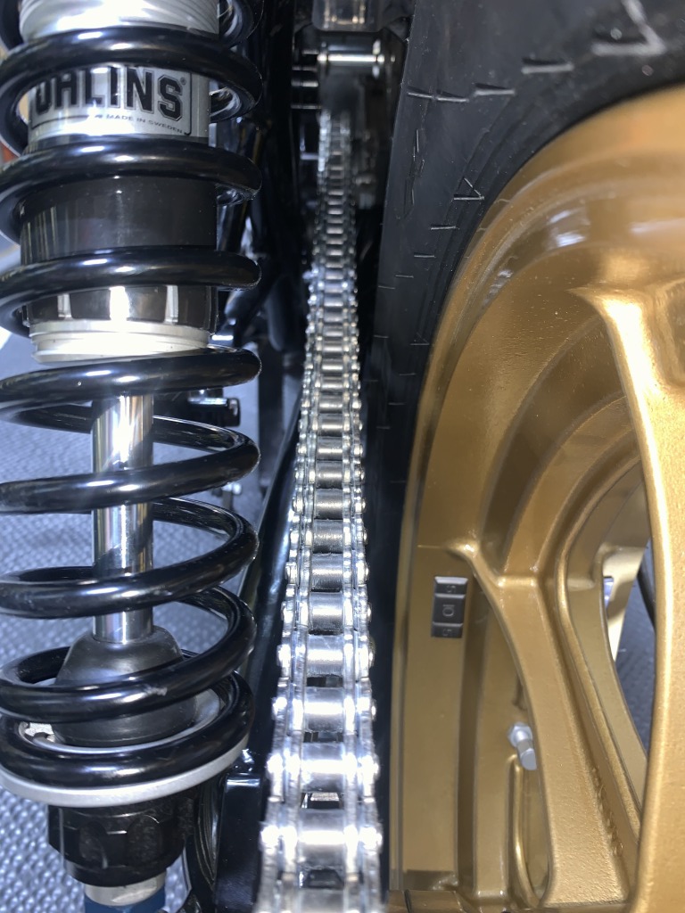 リヤショックはレイダウンと一緒に10ミリオフセット。チェーンとスプリングのクリアランスも十分です。