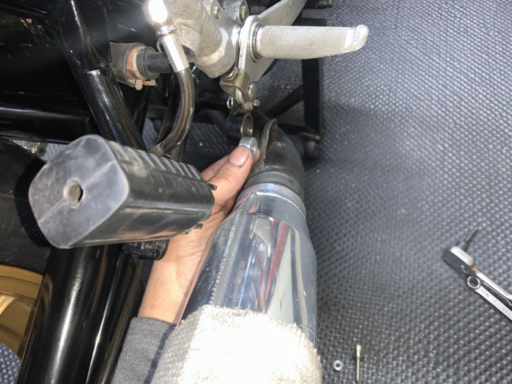 マフラーはだいぶ外側に来るので、サイレンサーのマウントはスペーサーを追加します。