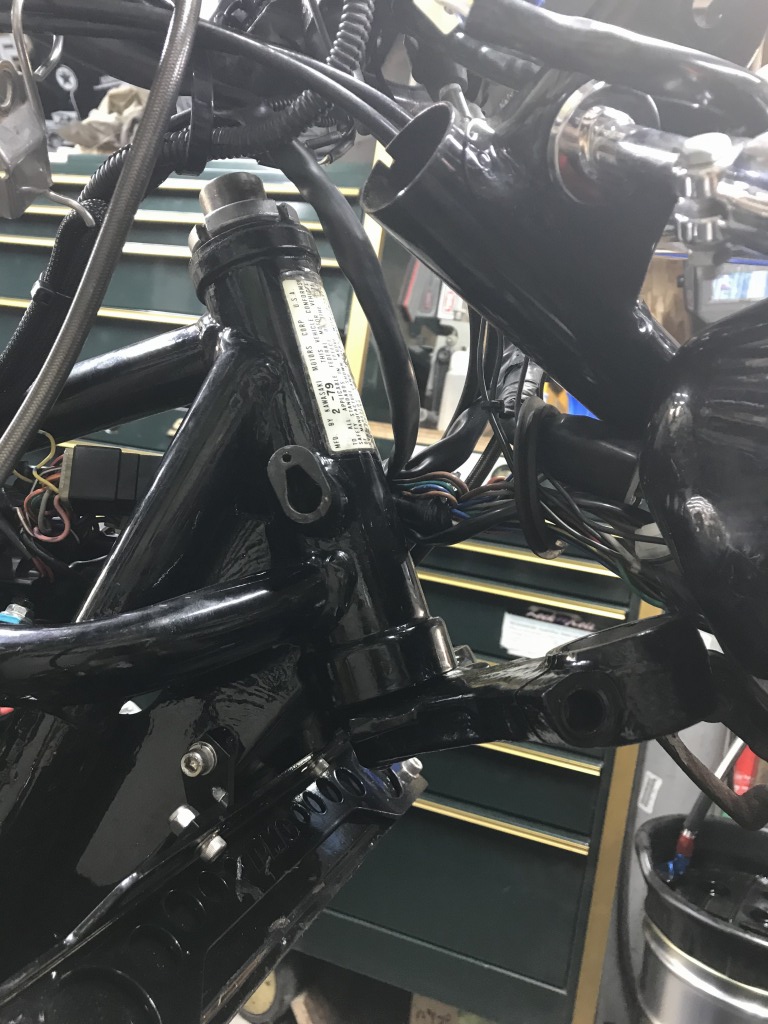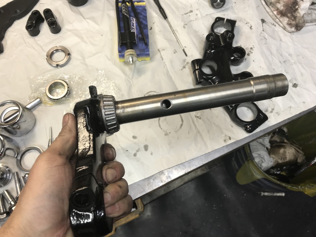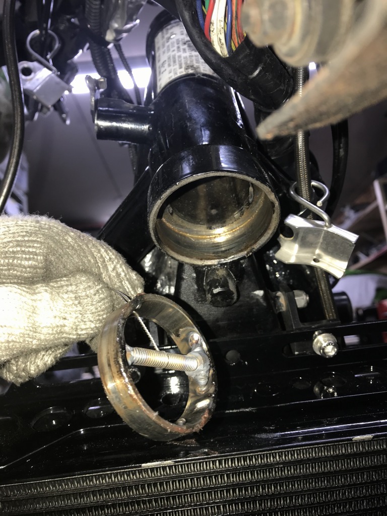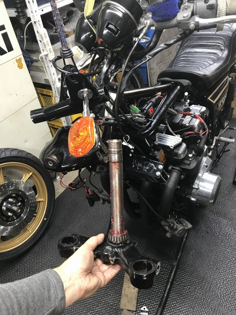 ステムベアリングはテーパータイプでした。アウターレースは内径への張り出しが無く引っかかりが無いので、ボルトを溶接してそれをたたいて抜き取ります。