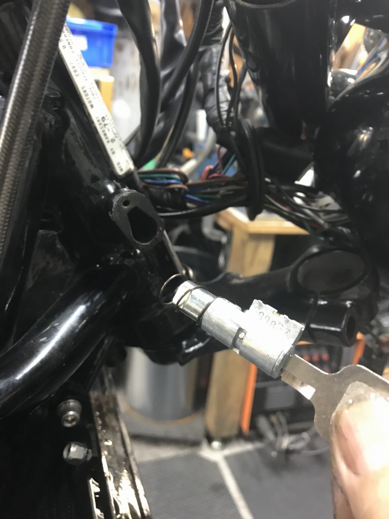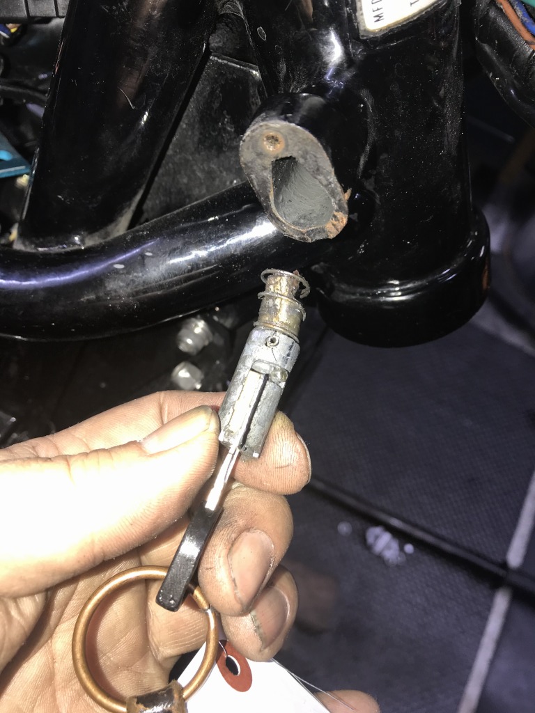 ハンドルロックシリンダーを外します。プランジャーは曲がって壊れていました。元々頑丈にはできていないので、強くハンドルをこじると曲がってしまうので、純正のハンドルロックは車検用程度にお考えください。