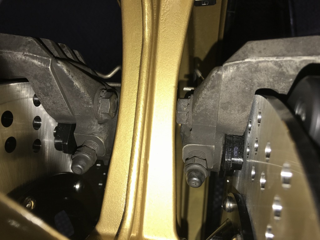 キャリパーとホイールスポークとのクリアランスは極わずかなので、キャリパーは0.5ミリのシムで外側に出して取り付けます。